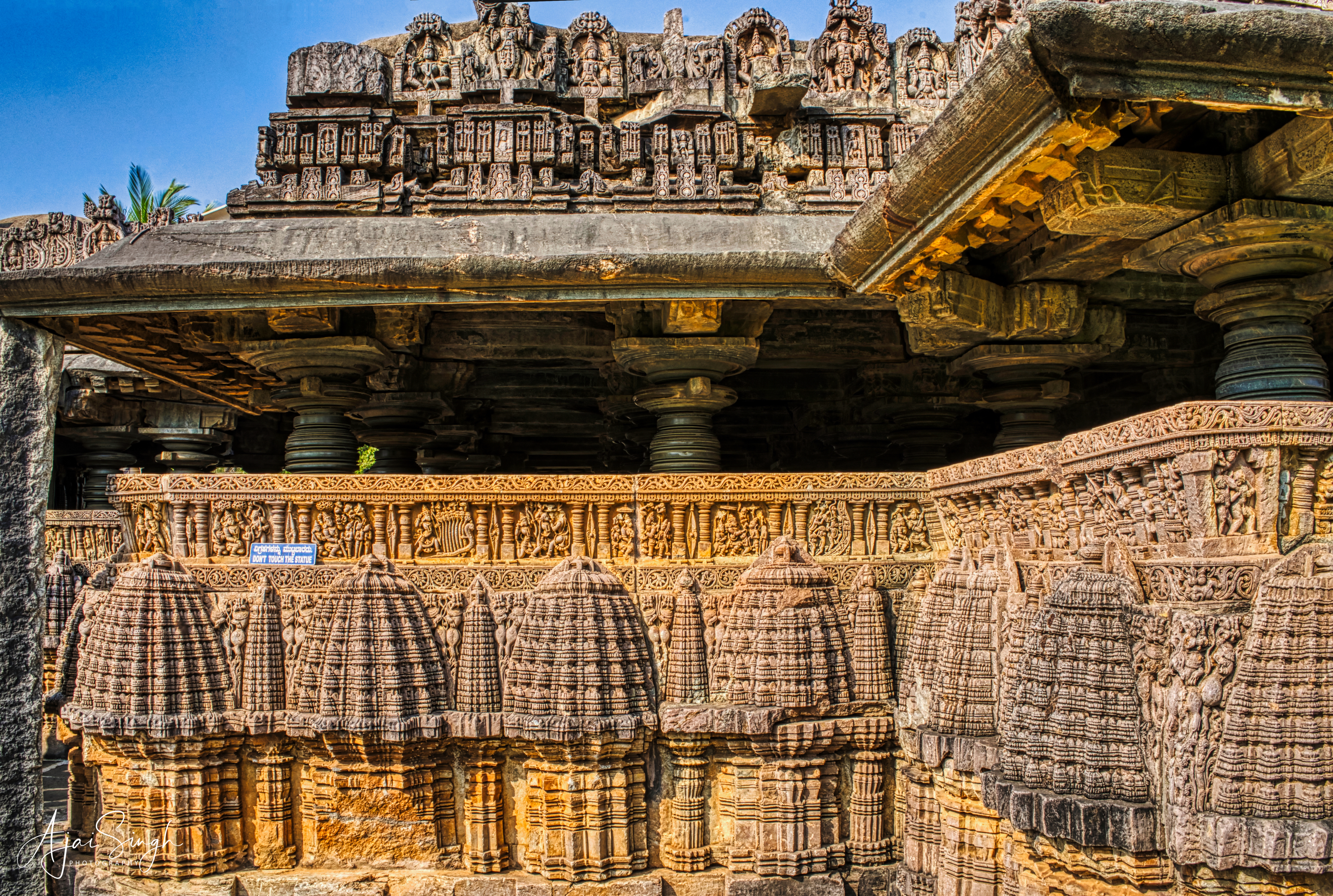 [ Image courtesy: Brig A.P. Singh - www.collectingmoments.in ] Parapet wall carving - Ramayana sequences from left to right. (1)Rama meets Sugreeva with his monkey army (2) Sugreeva hands him the ornaments Seeta has thrown down while Raana abducts her (3) Rama shoots through seven trees with one arrow to prove his prowess to Sugreeva. (4) Rama shoots an arrow from behind on Vali while Vali and Sugreeva fight (5) Sugreeva is coronated as the King of Kishkindha (6) Rama blesses Anagada or Hanuman (unclear) (7) Sugreeva's monkey army builds a stone bridge to Lanka with (8) Ravana's brother Vibheeshana approaches Rama for truce.