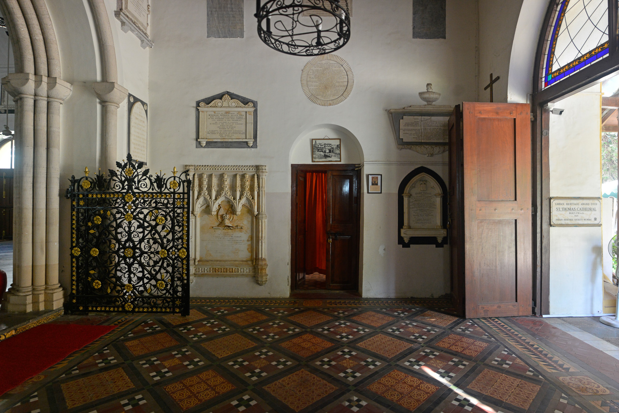 Entry to the St. Thomas Church is from the west (seen on the right). Walls on both sides of the entrance lobby are covered in memorials. The antechamber (seen in the center) is used as the choir room. Above the choir room door hangs an old photograph of the Church Gate, which was demolished along with the ramparts of Bombay Fort in the mid-1860s.