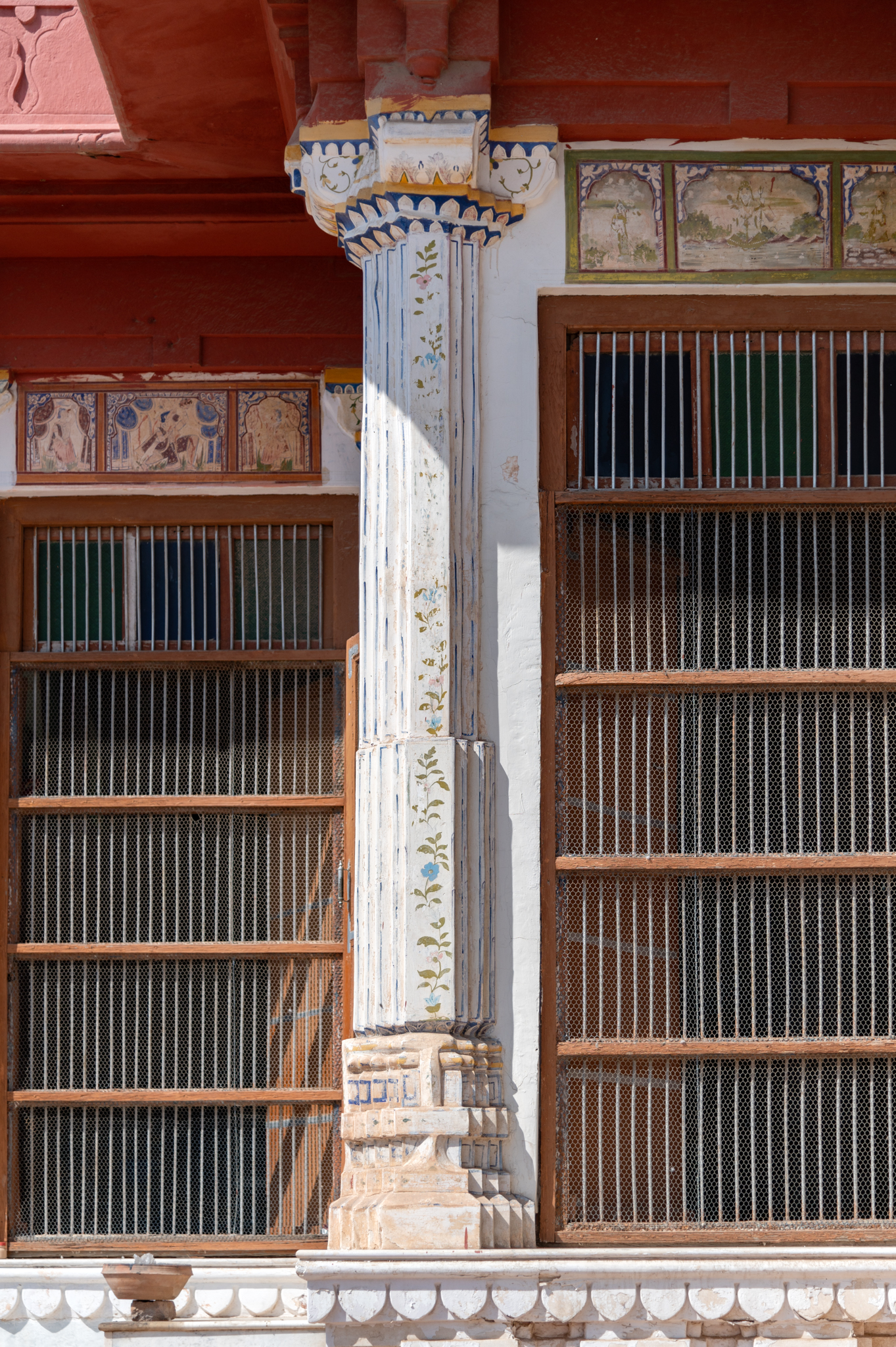 View of the pilaster from the east-facing elevation of the temple. These pilasters are slightly different from the pillars on the other side of the temple. Though the base and the shaft of the pillar are the same, the brackets are different. Also, these pillars are painted in white with multicolour floral motifs.