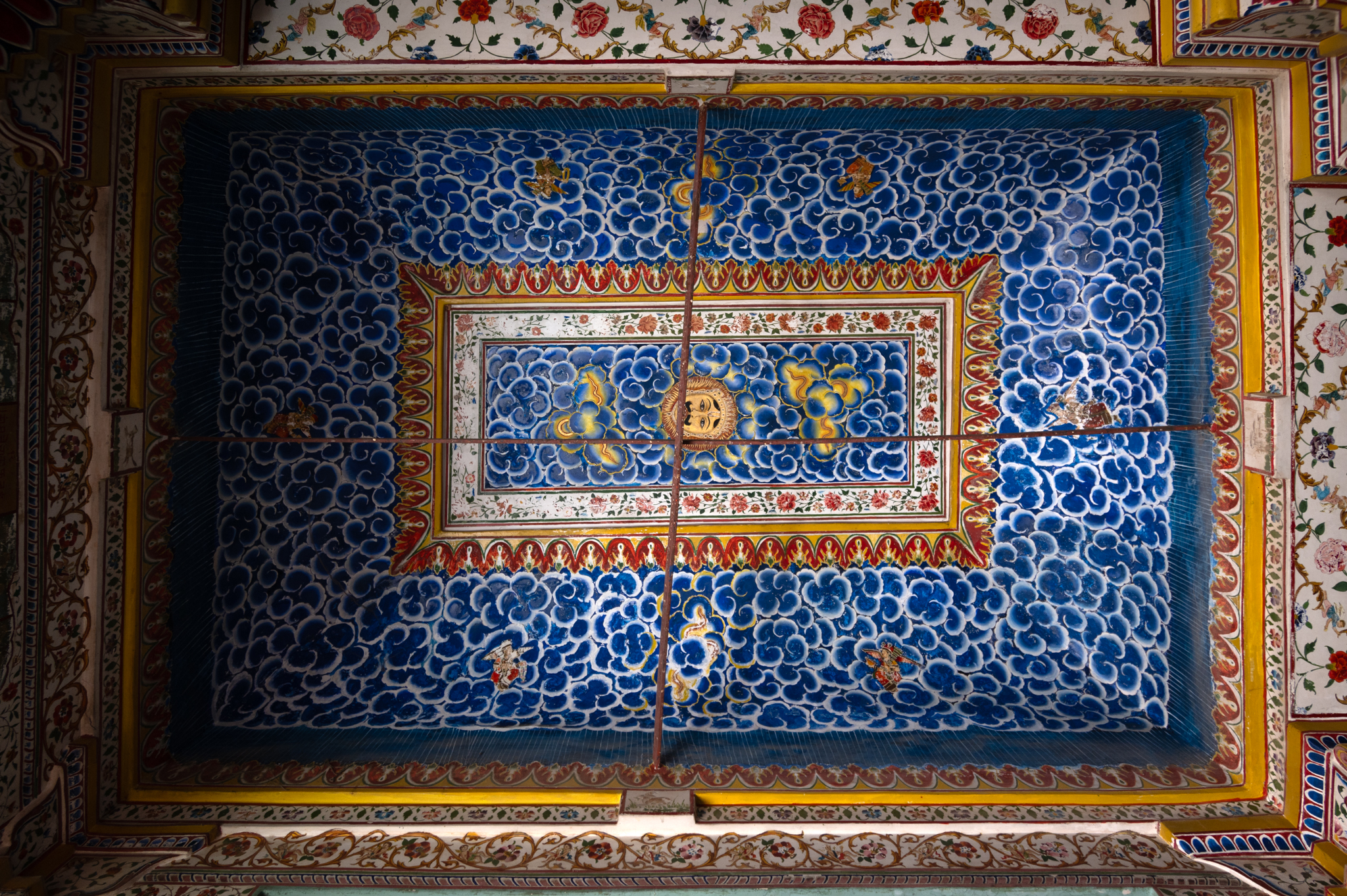 The aisles of the mandapa (pillared hall) of the Bhandasar Temple have a curved arch ceiling with bands of floral motifs on the corner, and the rectangular portion is filled with blue cloud-like designs. In contrast to the multicoloured dome at the centre of the mandapa, this blue rectangular ceiling stands out.