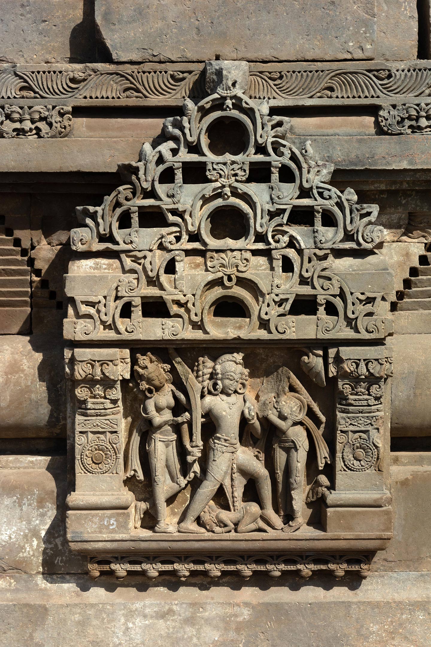 This panel depicts a warrior invoking raudram rasa (fury/rage) by aggressively wielding a drawn sword. The theme may be based on the medieval miniature painting of the Ragamala series. Ragini Lalita has a similar theme where the king departs for an expedition and the women of the palace convince him to stay. The central figure of a warrior-king is aggressively stepping forward wielding a naked sword in his right hand. A dagger is tucked into his kamarbandha (waist belt). The central female figure (seen on the left) may be a queen, who is trying to stop the man by pulling him behind. Another lady is standing in front of the man (seen on the right) and sporting long braided hair, but with her face and hands damaged. On the ground, between the feet of the man, a small figure (likely a servant) is grovelling for mercy.
