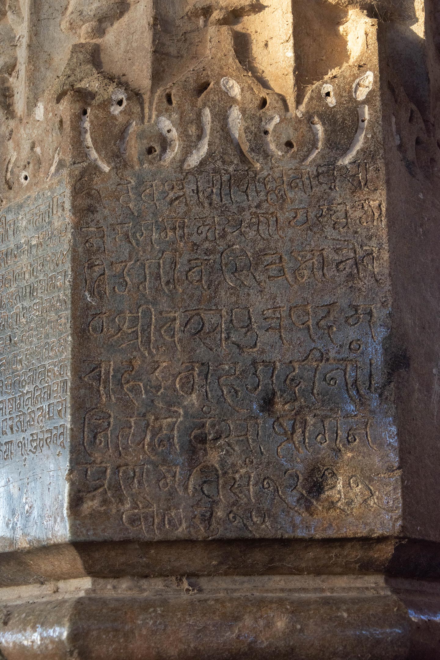 The inscription dated 1174 CE (VS 1231) commences with the words Deva shri Gokarllanaghvasi, reaffirming the deity’s name as Gokarna Deva. It is inscribed on a pillar within the mahamandapa (pillared hall) of the temple, alongside other informative inscriptions.