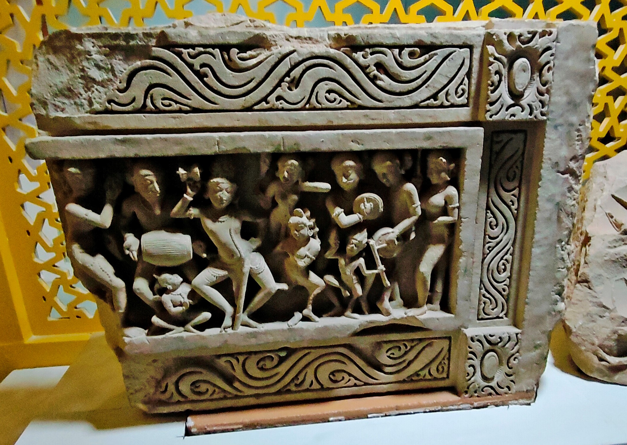 The panel depicting Shiva in his dancing form, Natesa, might have once adorned the ceiling of a lost Shaiva temple on Harsha Hill. Even though Natesa is not typically depicted as an independent sculpture in Rajasthan temples, he often appears as an important figure in the architectural spaces. He is elegantly portrayed above the doorway of the main temple at Baroli and elsewhere at Nilakantha and the later Chauhan Temple at Adhai Din Ka Jhonpra. Natesa is surrounded by various dancers and musicians. He is gracefully holding ḍamru in his right hand and possibly a trident in his left hand, which is significantly damaged. Tightly cloistered figures of dancers and musicians in action and angular postures not only provide visual centrality to the figure of dancing Natesa but also enhance the rhythmicity of the scene. To his immediate left is a musician holding a pakjavaja-like drum. The instrument occupies a central position in the squarish space created between Natesa and a dancer on the sides and between the face of the drummer and the dwarf at the bottom Image courtesy: Government Museum, Sikar