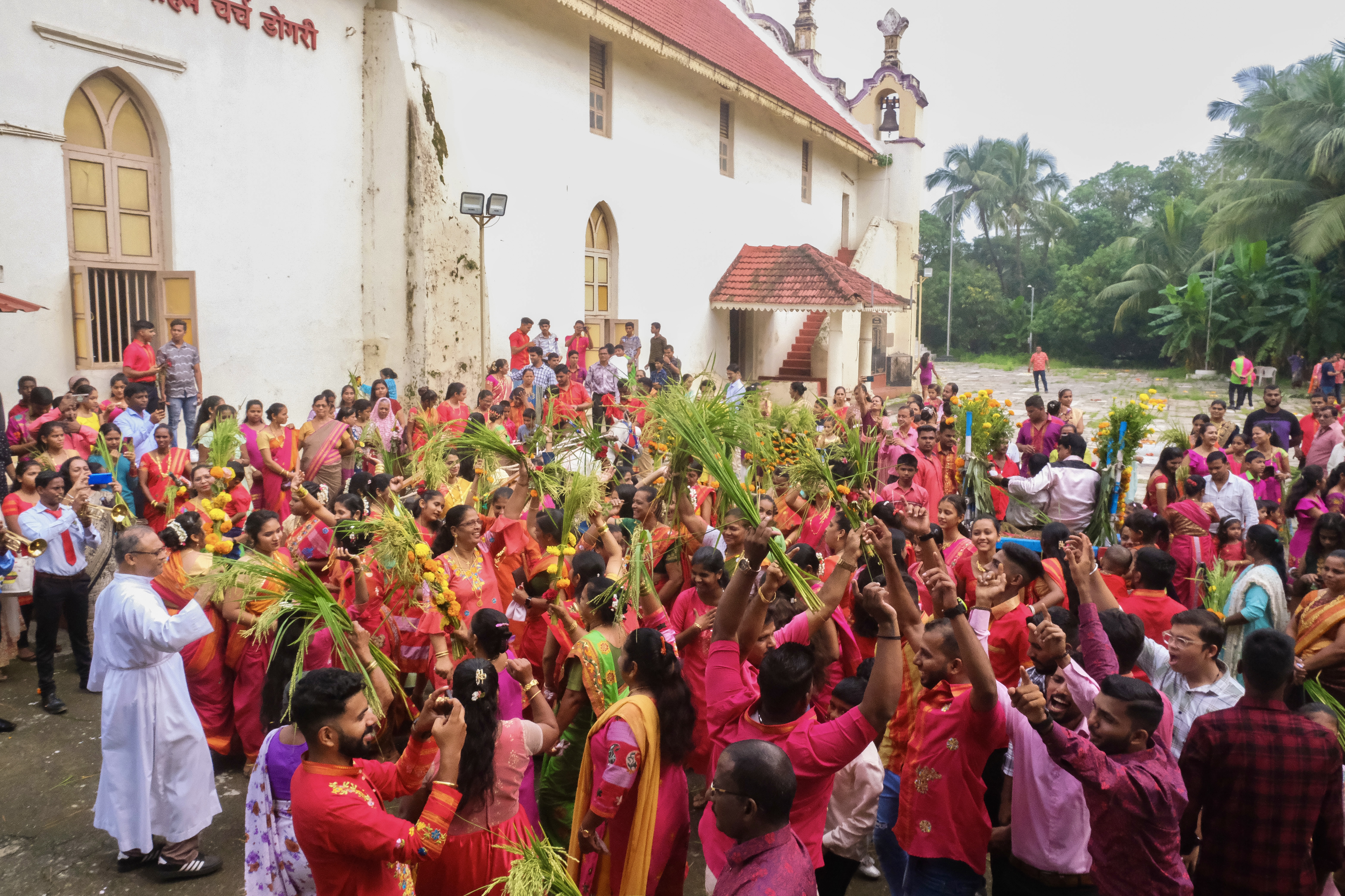 Traditional East Indian songs, dances, and music are performed in the courtyard for the community.