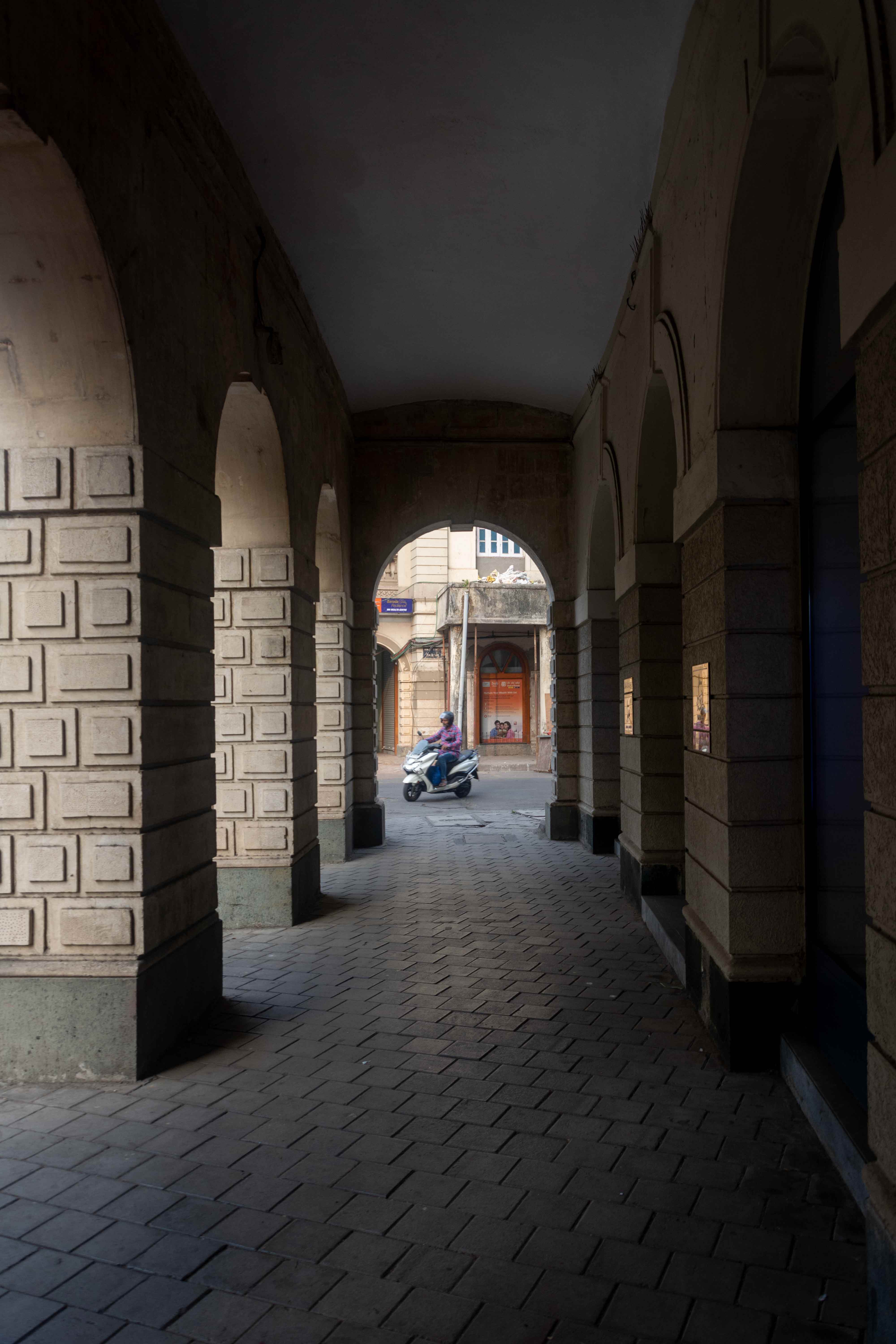 View from inside the arcade at Horniman Circle. The shady arcades are meant to provide protection from the sun during the summer months and from the rain during the monsoon season.