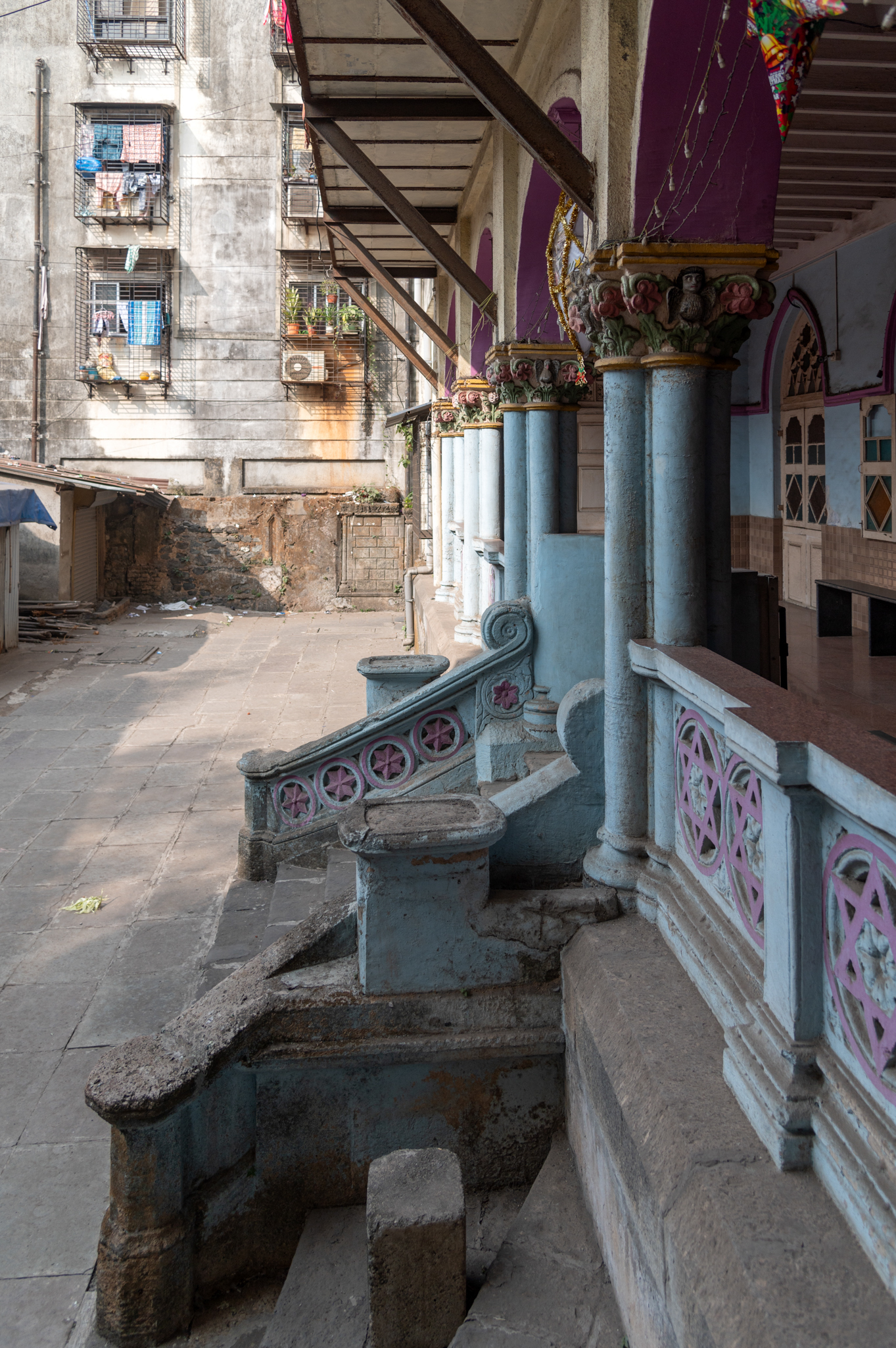 A short flight of steps connects the courtyard (now used for parking vehicles) to the front veranda. The balusters along the handrails feature the six-pointed Star of David motif, which also features on the parapet of the veranda. On either side of the staircase are squat pedestals, which may have supported statues or planters. The helical steps in the foreground lead to a side gate opening on the veranda.