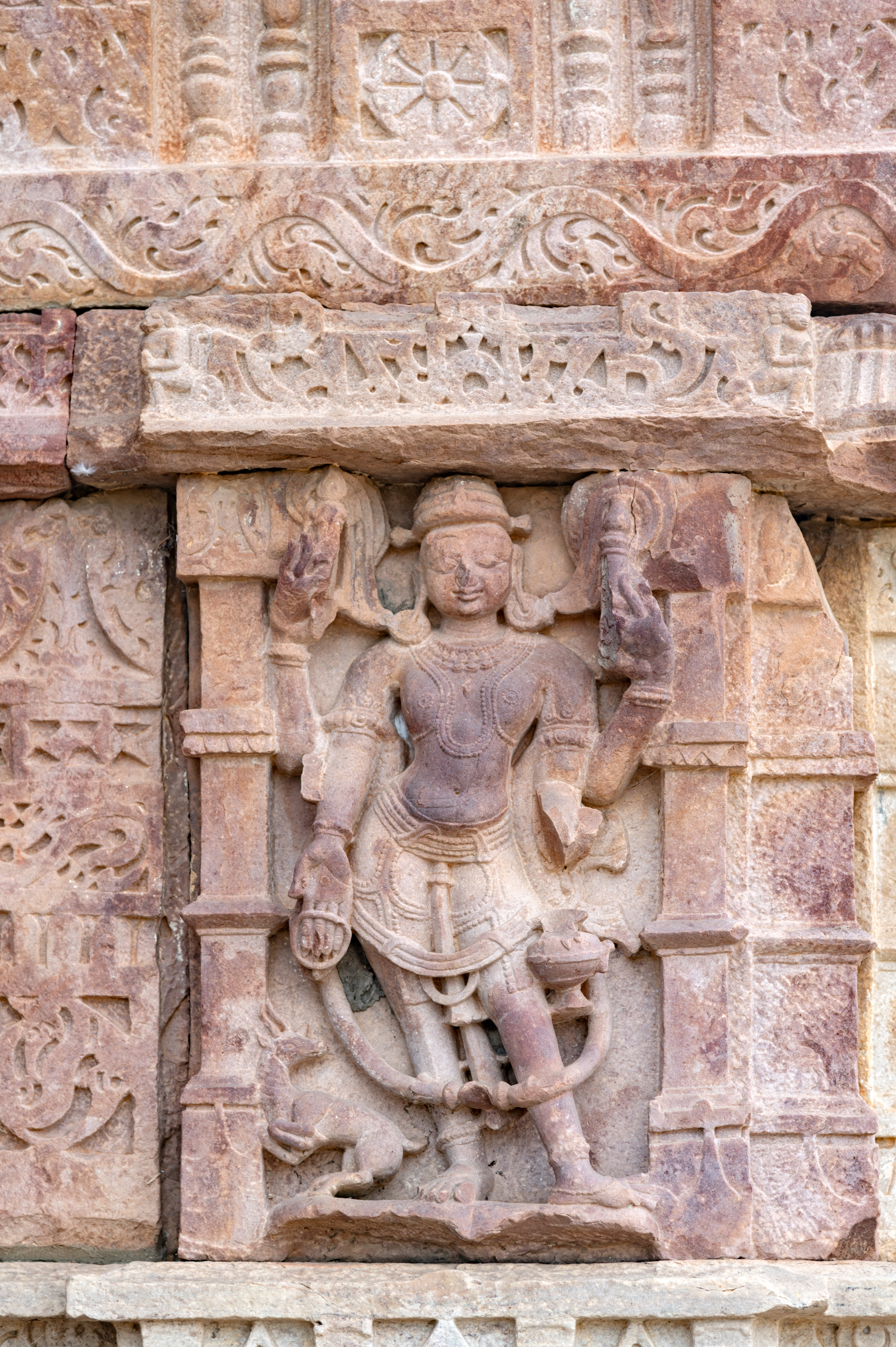 The opposite side of the niche, of the kakshasana (seat back) of the Undeshwar Temple, portraying Varuna features Vayu. Vayu is depicted as a tall, smiling figure with four arms, shown standing. He holds a staff in his upper hands, while a kamandalu (water pot) and a gesture of varadaksha (of blessing) are depicted in his lower hands. At the bottom of the niche, Vayu's vehicle, the antelope, is depicted in motion.