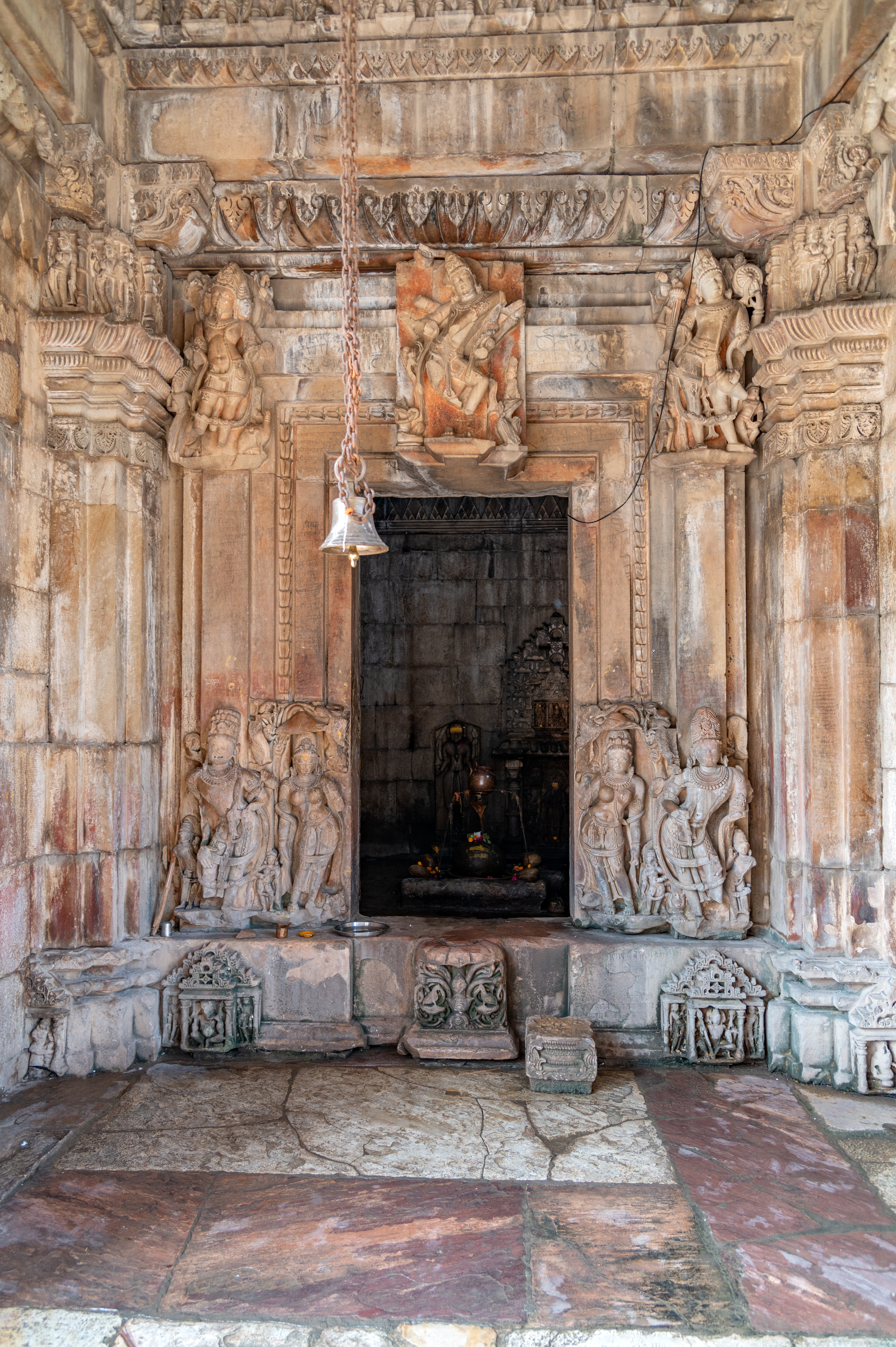The garbhagriha (sanctum sanctorum) can be accessed through a doorframe which is carved with the figures of river Goddess and dvaralapalas (door guardians) at the bottom and the trinity—Shiva, Vishnu and Brahma on the lintel. The dvarashakas (architraves or doorjambs) are plain except for one, which shows a floral design.