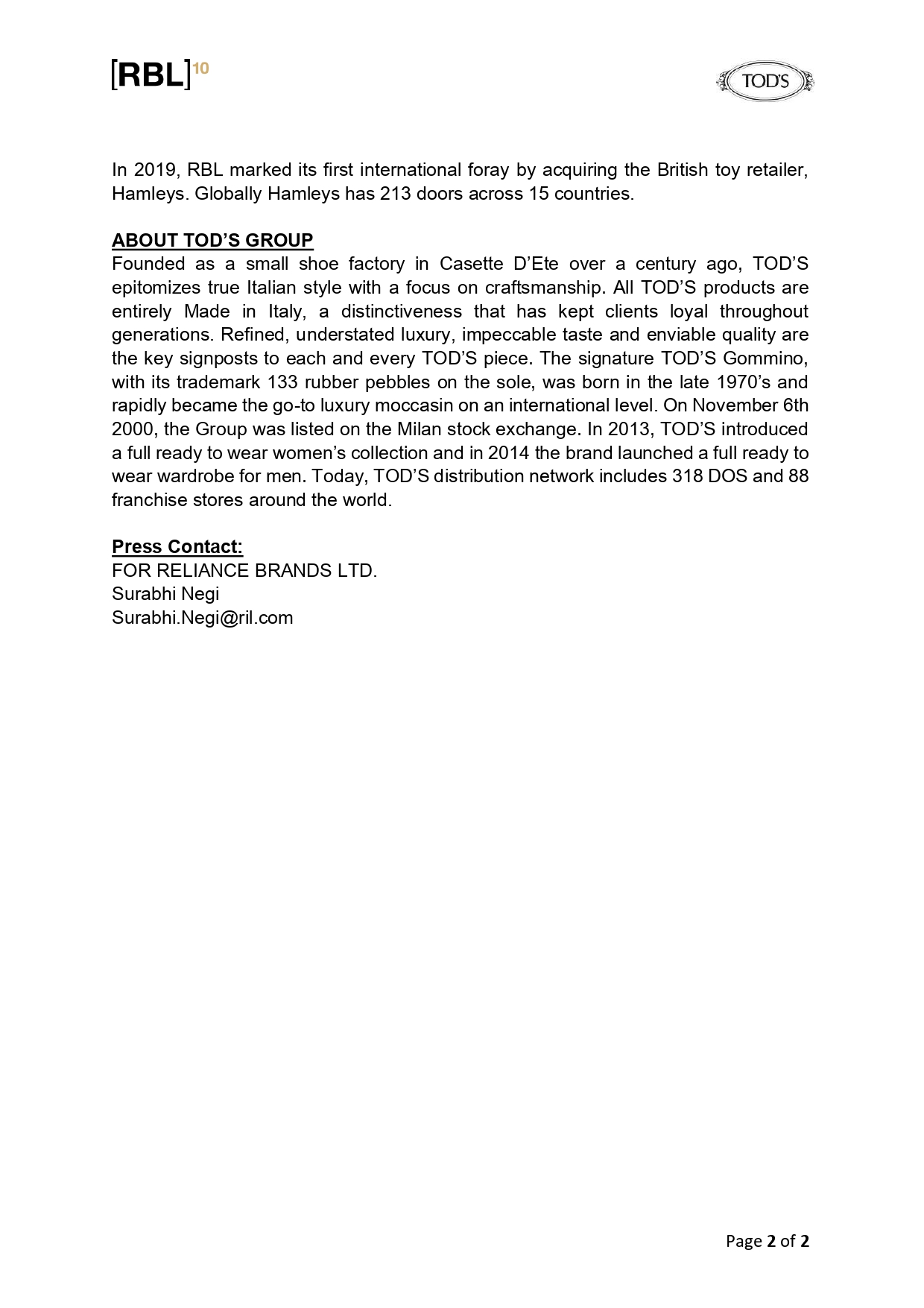 Tod S.P.A and Reliance Brands Limited enter Franchise Agreement Public Deposited