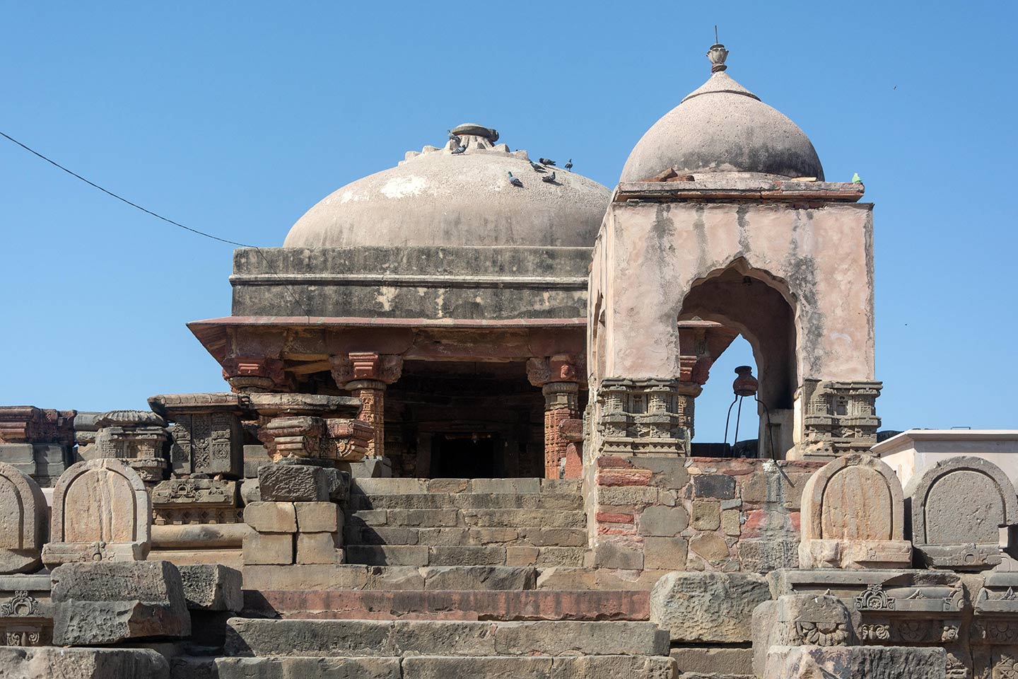 Front view of Harshat Mata Temple and Nandi shrine (east). The original stone temple was built in the Mahameru style and was destroyed and replaced by a circular domed structure at a later period when the temple was reconstructed. The present temple has used broken fragments from the original temple in the foundation and pillars and a mix of modern materials in the dome and remaining parts.