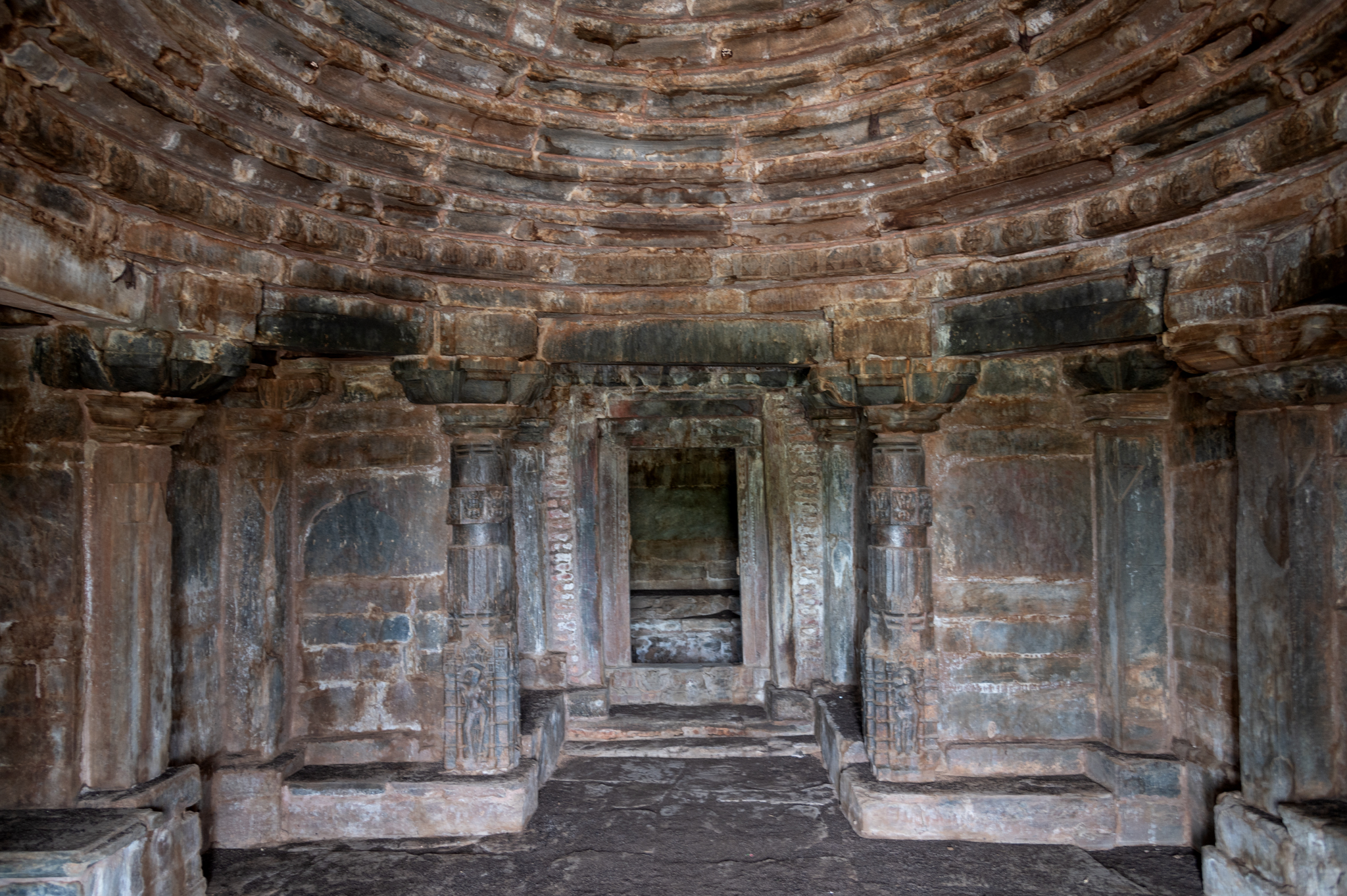 Seen here is the interior of the mandapa (pillared hall) of the Jain Temple. The mandapa is astylar in plan meaning that the central portion does not contain any pillars. The pillars are lined along the corners of the mandapa. The entrance to the garbhagriha (sanctum sanctorum) is right in front of the main north-facing entrance to the temple. The west and east sides of the mandapa have relief transepts. The stone interiors of the temple are heavily damaged owing to a bat infestation.