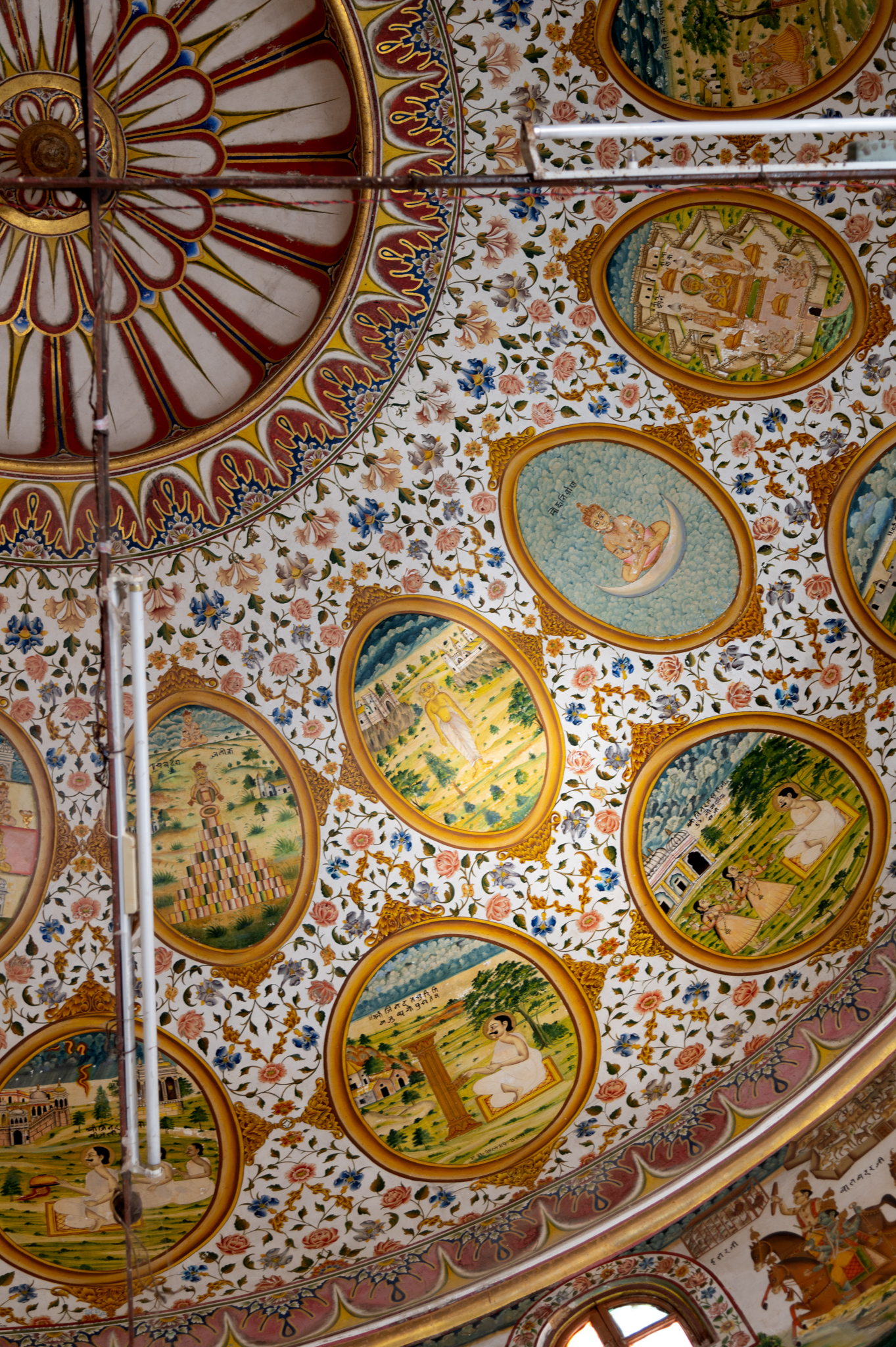 A closer view of the paintings in the oval cartouches in the ceiling of the mandapa (pillared hall) of the Bhandasar Temple. Seen here are many ovals depicting different stories. The lower set has stories of miracles of Jinadatta Suri, like saving a child’s life, procuring the sacred scriptures hidden inside a pillar, and capturing the lightning in his alms bowl. The upper circle has Jain monks and auspicious symbols for Jain tradition like Chaude Rajlok and Mokhs Parinirvana, enunciating the worldly life. The oval shapes of the paintings are designed like mirror frames. This style is influenced by European paintings, especially the Company style paintings produced during the 18th – 19th centuries CE.
