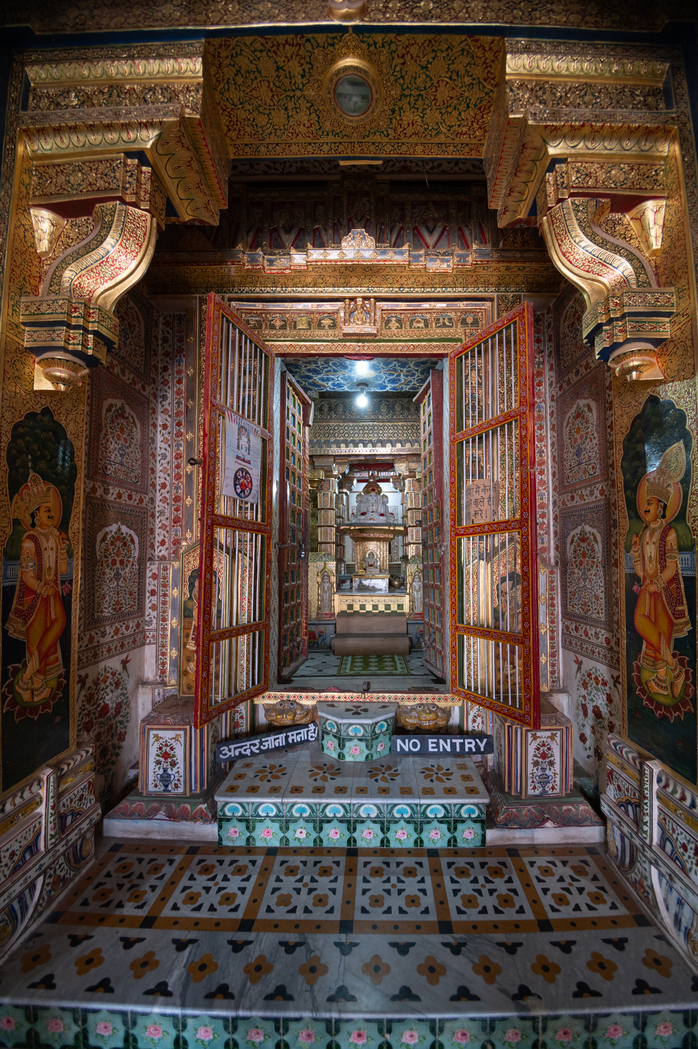 Seen here is the principal east-facing entrance to the garbhagriha (sanctum sanctorum) of the Bhandasar Temple. The original fabric of this entrance has been enveloped in golden embossing. The pilasters, doorway, and dvarashakha (architrave) are adorned with golden meenakari (enamel) work. Intricate details of the floral motifs cover the entire surface of the entrance. The wooden doorway has attendants painting on it.