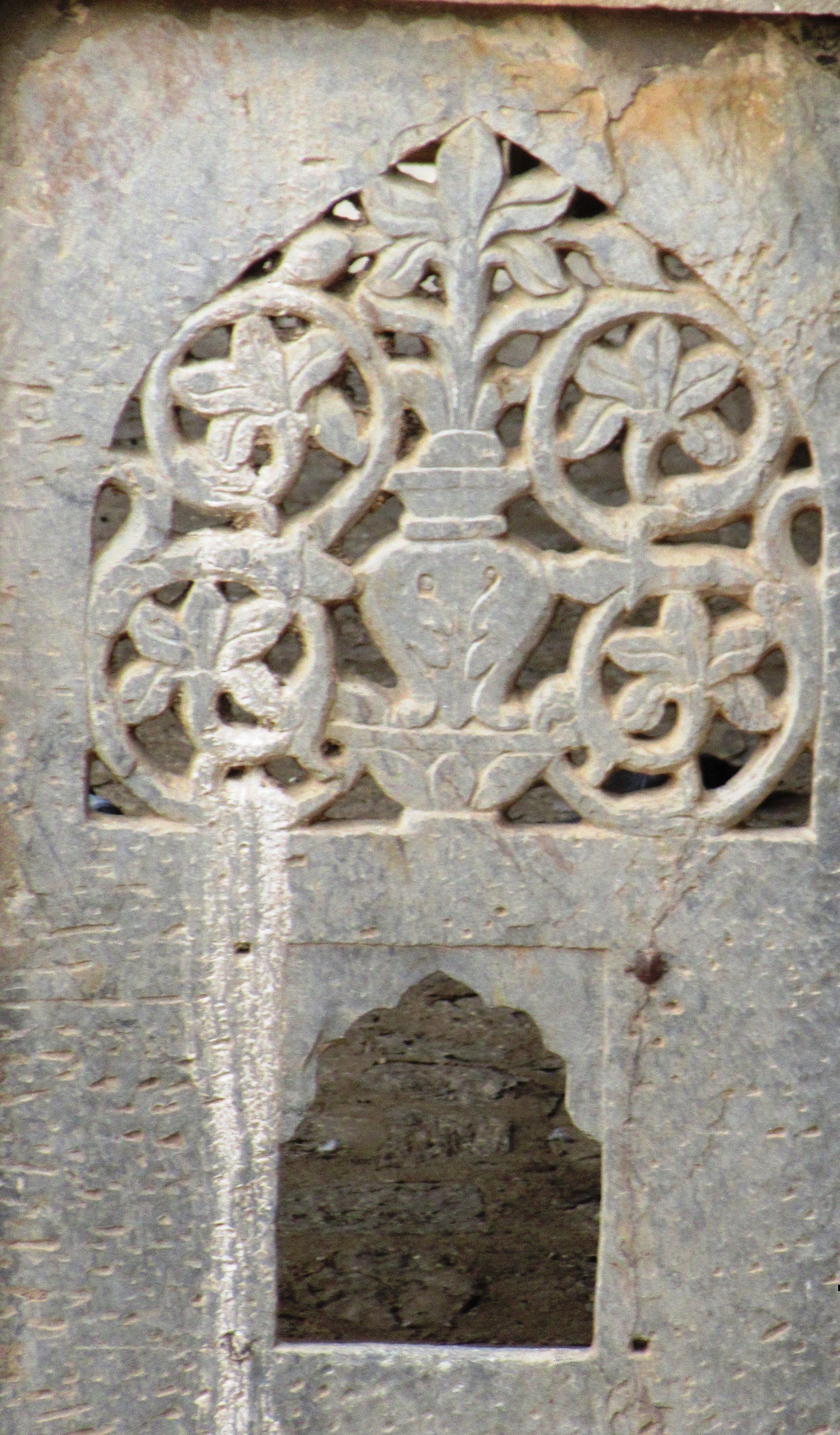 A lattice window showing a flower vase. The room is colonnaded and spacious with cusped arches. The entry within the ‘palace’ can be made through two flights of stairs on both ends. The arcade is four-sided with pointed arches. It is also known as the Summer Palace. Small jalis are present on the windows.