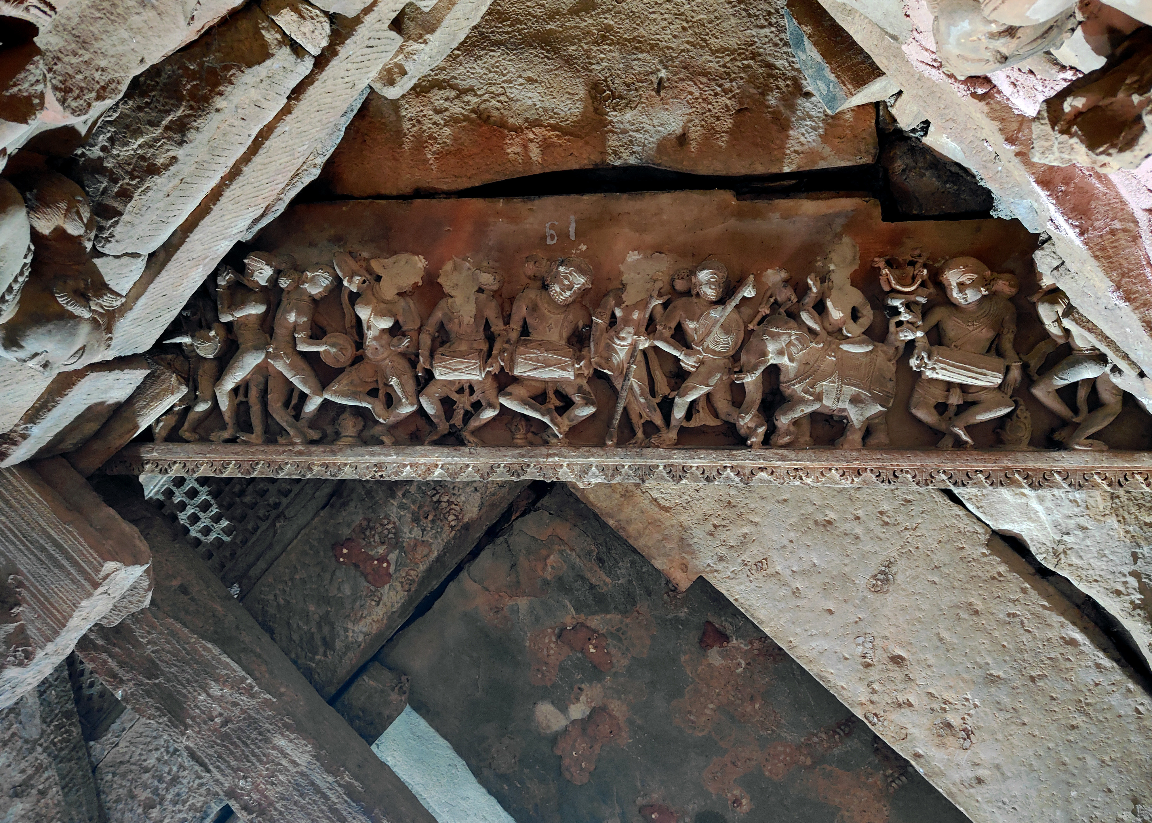 In the frieze (of the ceiling of the Harshnath Temple sanctum) of the drumming and dancing gods, is Indra seated on his elephant Airavata, accompanied by a warrior holding a sword and shield and an apsara. Stella Kramrisch, in her work Hindu Temples (vol-2, plate LXVIII, pg 402-403), describes the spirit of the image as follows: ‘the movement sways and surges to either side of a standing god who holds a long lance and seems to have ushered in before Indra the warrior so that he becomes one of the dancers. Indra, enthroned in a posture of ease, the right hand raised in Abhaya-mudra, grants fearlessness; his left-hand holds the Vajra. Small shapes surround him, Matali, his mahout, and companion spirits, Marut-like. The elephant's trunk and the warrior's legs are interlaced; the warrior's is the largest movement; across the depth of the relief, he steps forward into the line of the celestials. Their dance vibrates, to the stamping of the feet, a suave tremor free from tension.' This image resonates with verse 7 of the Harsha stone inscription of Vigraharaja II which mentions that the Lord Harsha (Shiva) is worshipped on the hill by a joyous divine host, Indra.