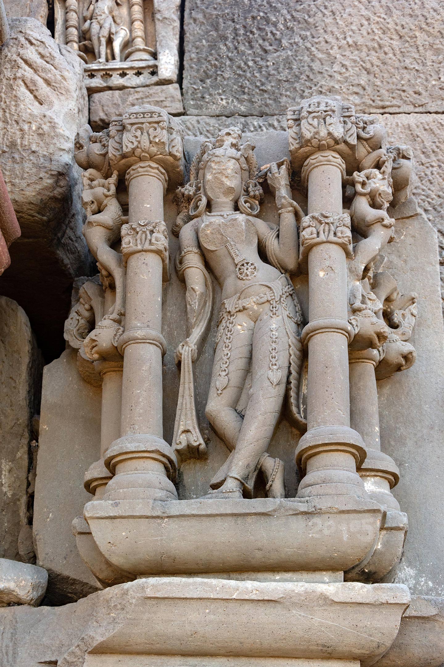 The adhisthana has depictions of various Hindu gods and goddesses framed within elaborately carved panels. This panel has an apsara (celestial nymph) or surasundari (young girl as a symbol of graceful beauty) framed between two pillars decorated with yalis and other mythical creatures. The female figure may be an apsara (celestial nymph) or surasundari (young girl as a symbol of graceful beauty) standing in the tribhanga pose (triple-bend). She holds a darpana (mirror) in her left hand and the free end of a dupatta-like garment wrapped around her arms, back, and shoulder in her right hand. While the face is badly damaged, the headgear and hoop earrings are still discernible. Among the various ornaments she is wearing, is a pendant hanging till the navel and two leaf-shaped pendants hanging from chains attached to the katibandha (decorative belt) around her waist.