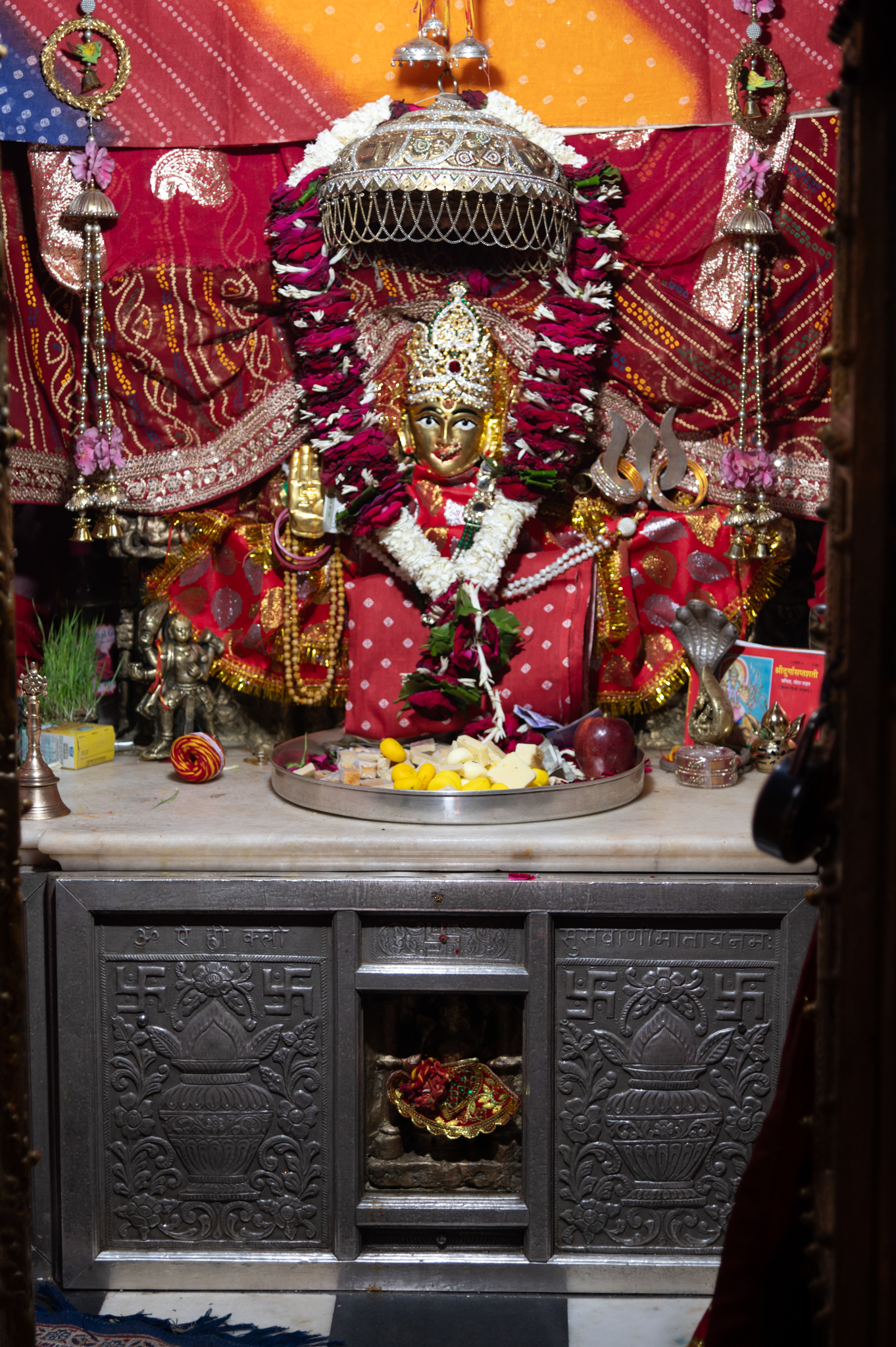Main shrine image of Suswani Ma inside the garbhagriha (sanctum sanctorum) of the Suswani Mata Temple. The image, covered in drapery, is shown sitting on a rectangular pedestal.