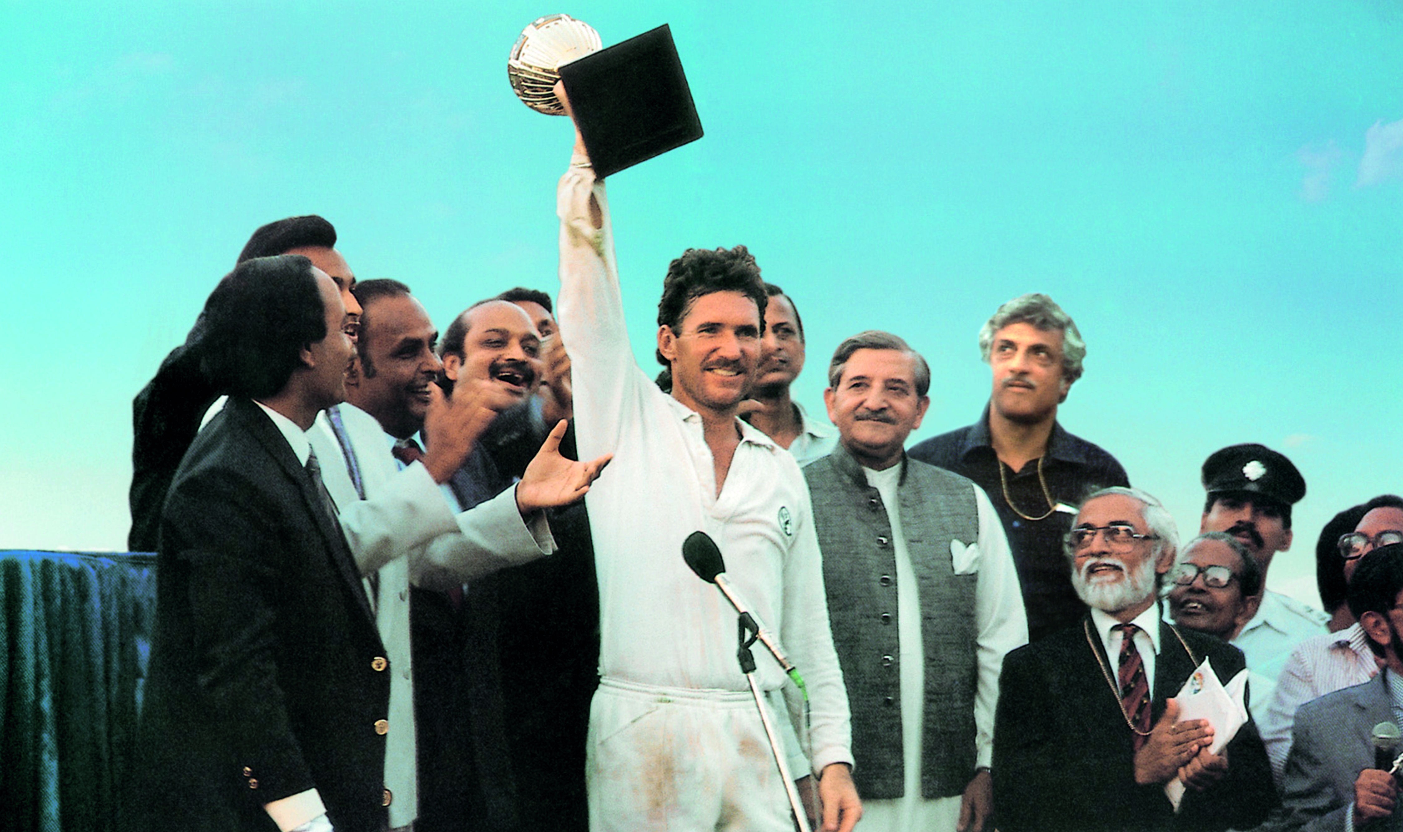Reliance was the official sponsor of the 1987 Cricket World Cup jointly held in India and Pakistan. The World Cup was renamed the Reliance Cup. After the final, Shri Dhirubhai Ambani handed over the winner's trophy to Allan Border, captain of the Australian team at Eden Gardens, Calcutta. Image Courtesy: Reliance Industries Limited.