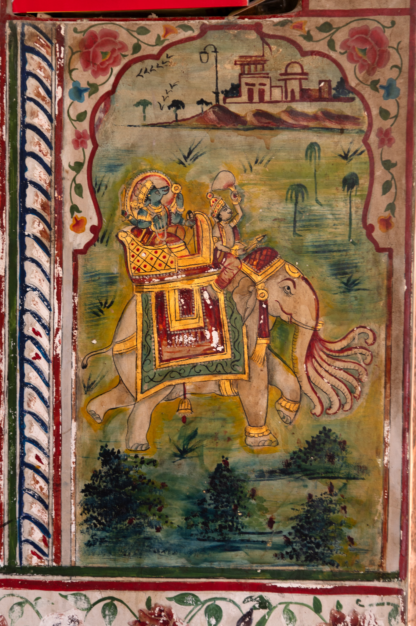 Closer view of one of the paintings that frame the side doorways on the mandapa (pillared hall) of the Bhandasar Temple. Seen here is the painting of Vishnu sitting on an elephant. A mahut (charioteer of the elephant) is shown riding it in the city. The elephant has multiple trunks. The jewellery worn by Vishnu, the elephant and the canopy, in which Vishnu is shown sitting on the elephant's back, are embossed with gold.