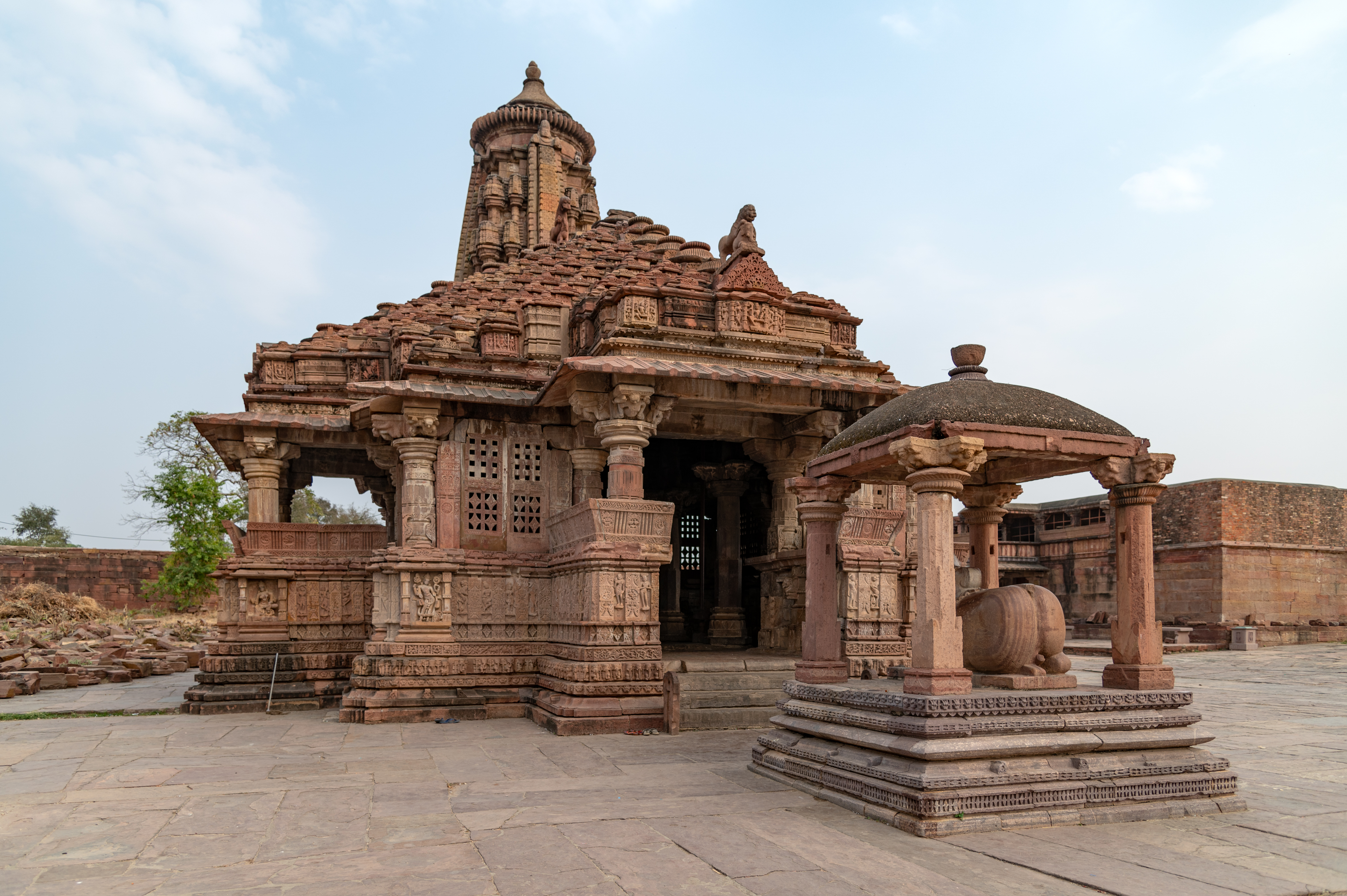 Seen here is the Mahanaleshwar Temple from its eastern side, which is the principal ingress of the temple. There is a Nandi mandapa (pillared hall) in front of it. The imposing shikhara (superstructure) of the temple is seen in the skyline. The temple has a sabhamandapa (big pillared hall) which is a semi-open variety having dwarf walls to the north and south sides.