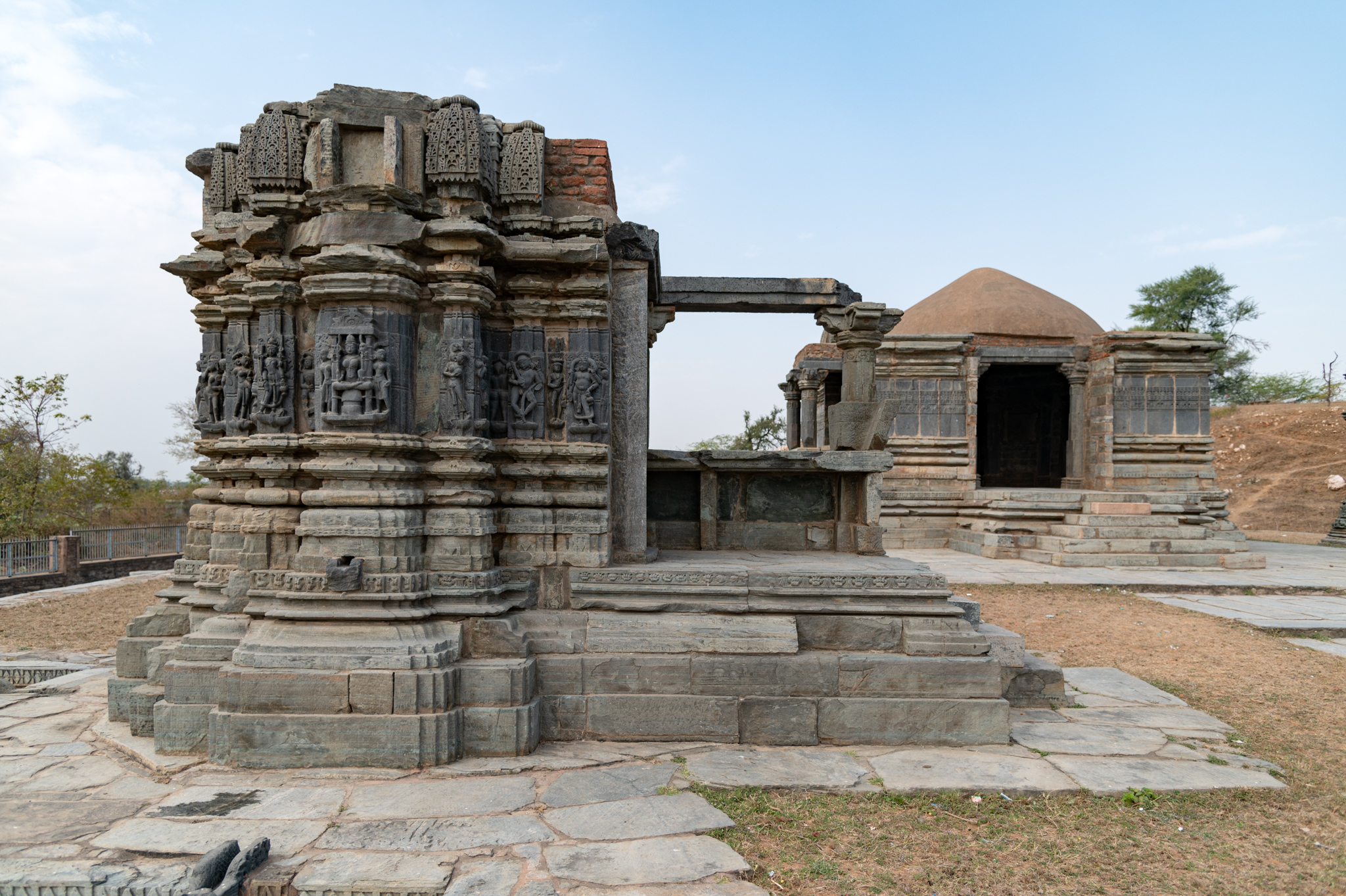 View of the side shrine from the panchayatana (main shrine with four subsidiary shrines cardinal to the main temple) setup of the Someshwar Mahadev Temple. Not all these shrines have survived, except the shrines to the northwest and southeast of the main temple. This is the shrine to the southeast of the main temple. The four side shrines in the complex are single shrines dedicated to different deities, probably Vishnu, Ganesha, goddess, and Surya. Of the shikhara (superstructure) on these shrines, only a few aedicules of the base have survived.