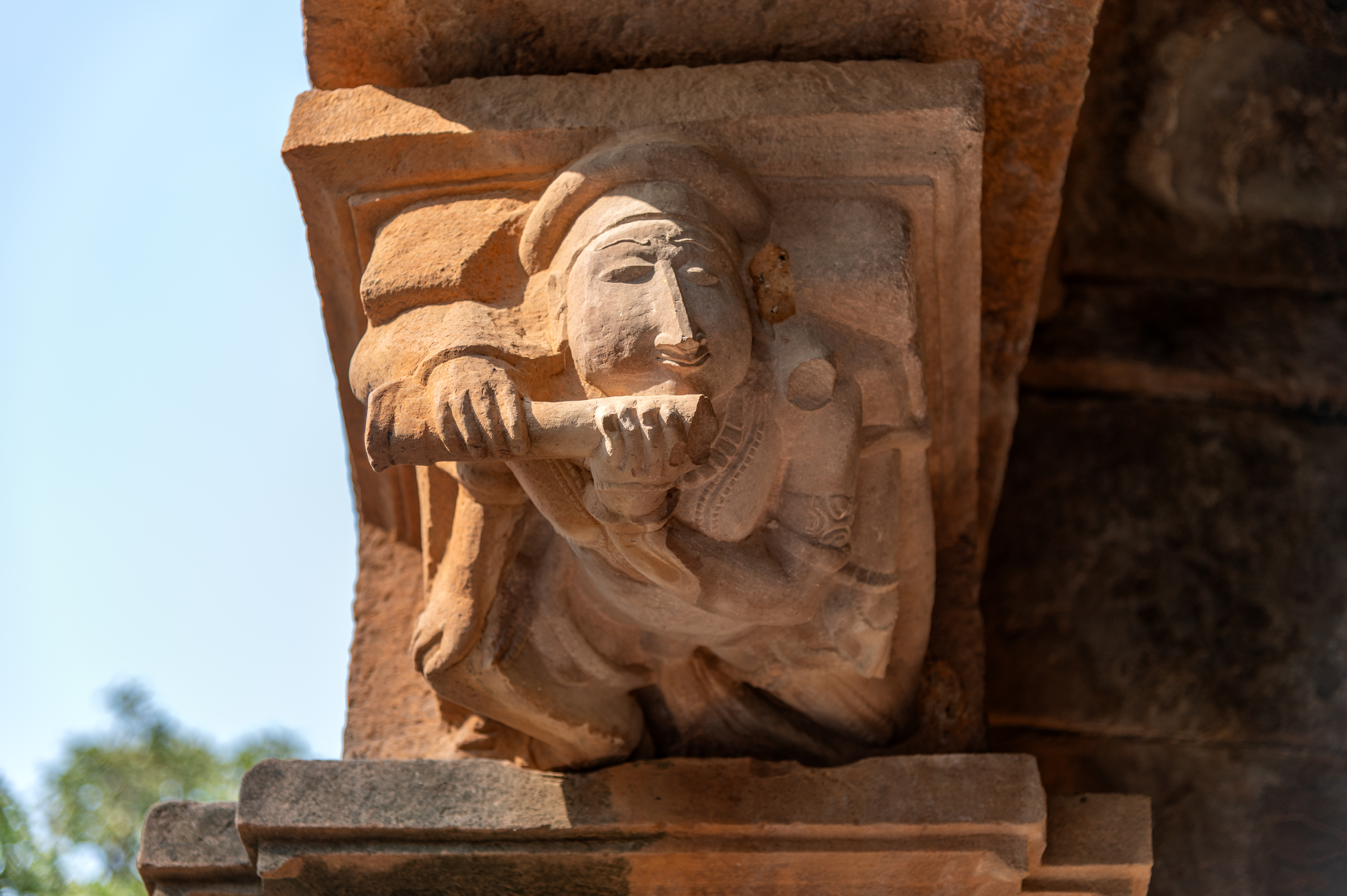 At the upper part of both pilasters, bharavahakas (load bearers) are depicted. Interestingly, the bharavahaka on the right pilaster is shown playing the flute.