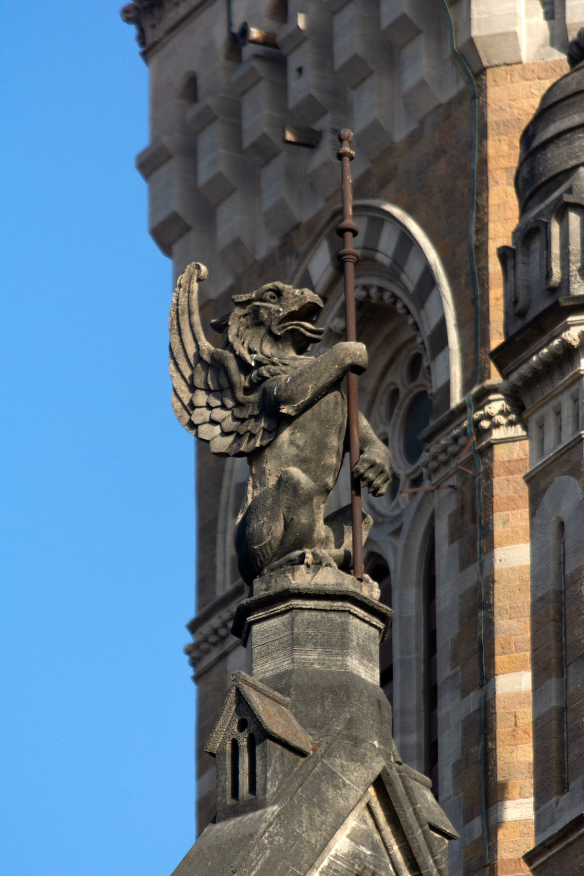 Gargoyles are another design element Frederick W. Stevens incorporated from Venetian Gothic architecture. Gargoyles, chimeras and griffons became very popular motifs in cathedrals, churches and castles in the Middle Ages in Europe. In Mumbai, they appear extensively in many of Stevens’ buildings, notably more at CSMT. At the BMC building, they are used sparingly, perched on top of turrets.