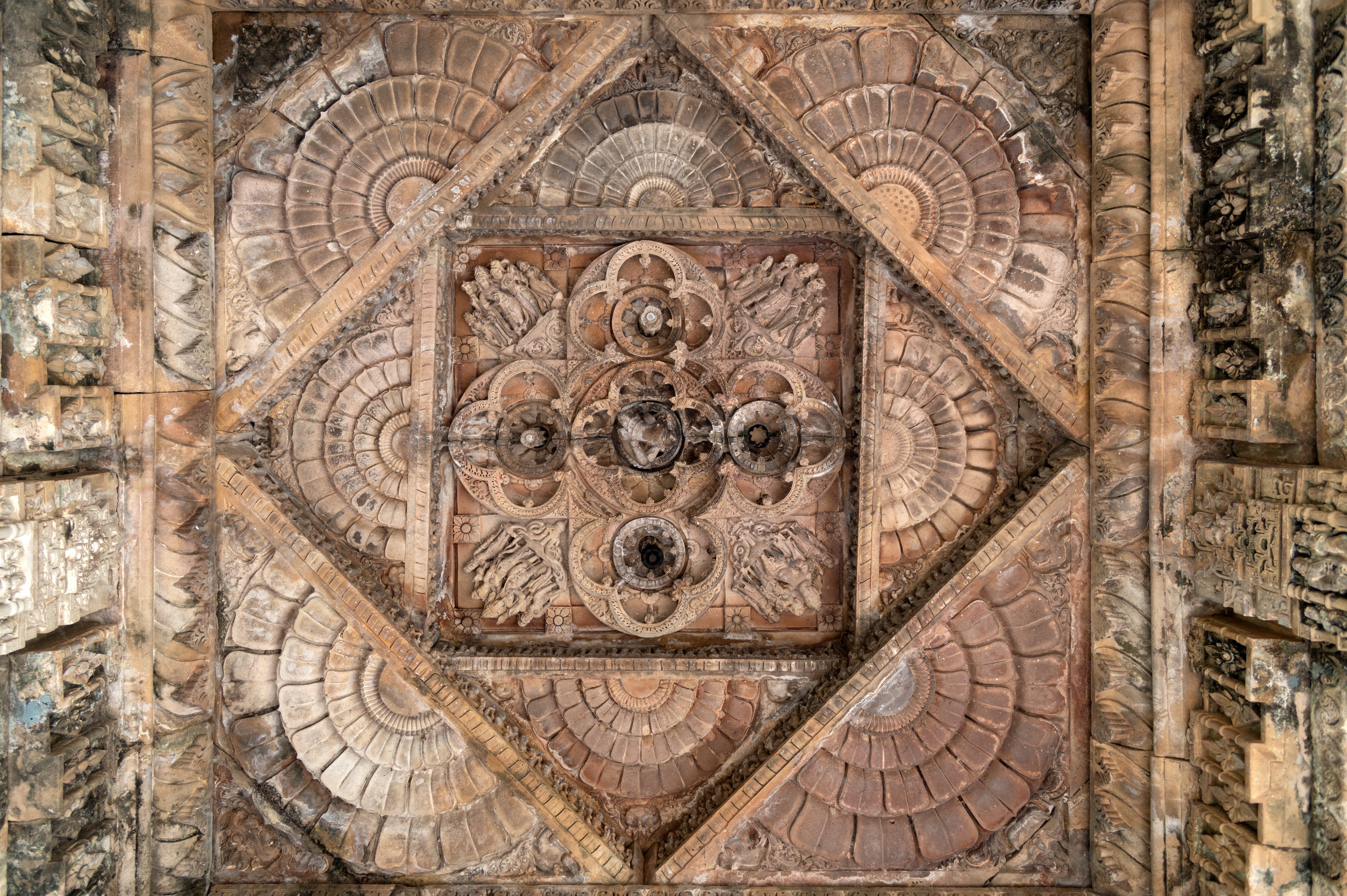 The ceiling of the mukhamandapa (front porch) is square in shape and intricately carved with floral motifs and figures of gods accompanied by their consorts. The corners of the ceiling are decorated with half-lotus medallions. The inner square repeats the same pattern and the innermost square depicts lobbed arched four-petal flowers at the centre and on each side. Notably, the corners of the innermost square feature depictions of Ganesha, Brahma, Vishnu, and another deity with their consorts, flanked by female attendants.