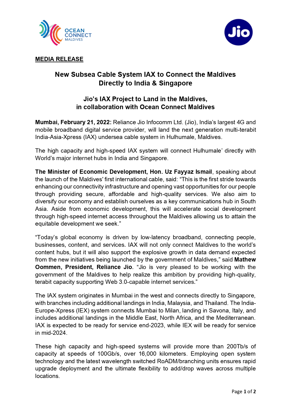 Jio, working with the Government of Maldives, lands the next generation multi-terabit India-Asia-Xpress (IAX) undersea cable system in Hulhumalé, Maldives, which will connect the Maldives directly with the world's major internet hubs in India and Singapore. Image Courtesy: Reliance Industries Limited.