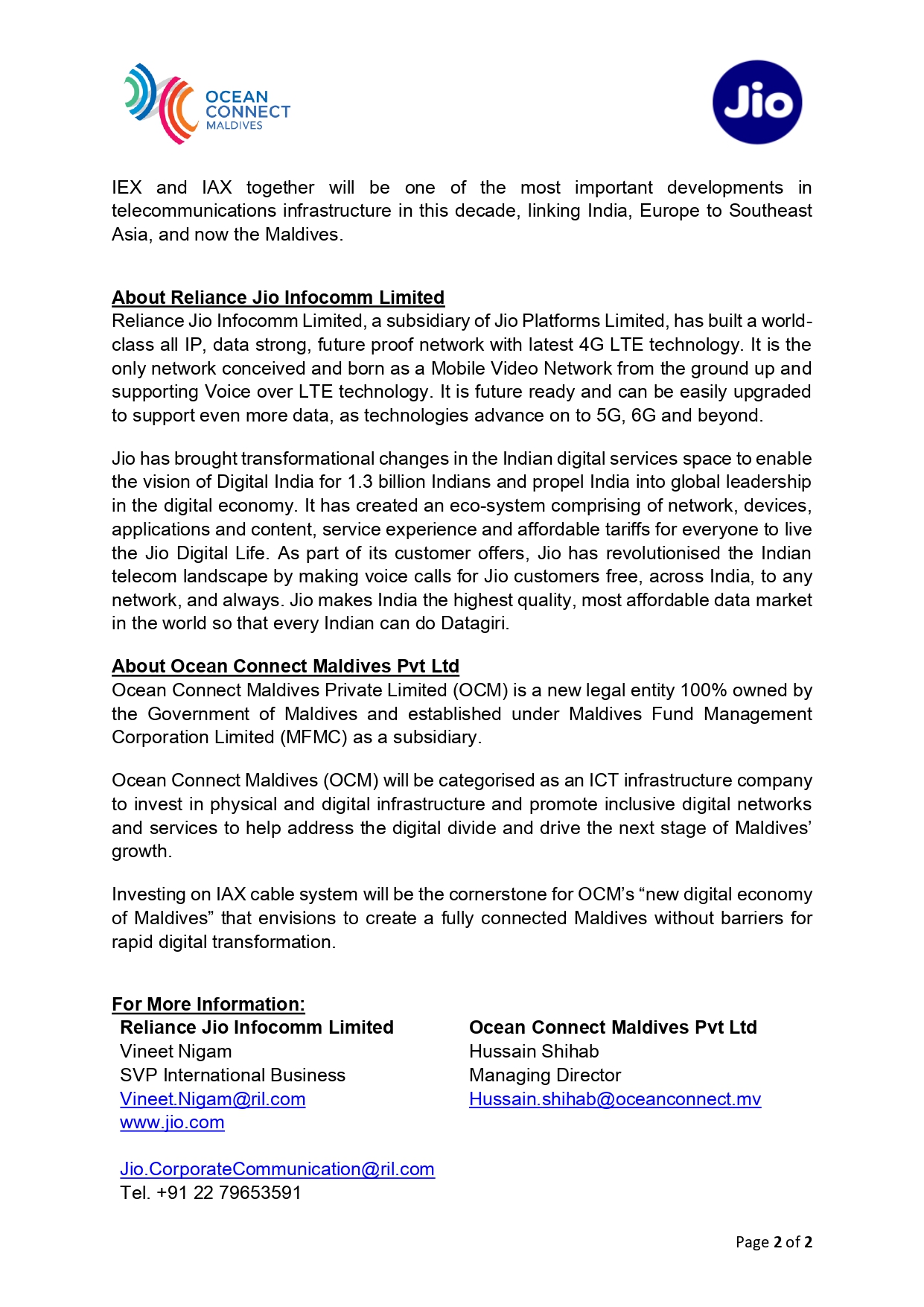 Jio, working with the Government of Maldives, lands the next generation multi-terabit India-Asia-Xpress (IAX) undersea cable system in Hulhumalé, Maldives, which will connect the Maldives directly with the world's major internet hubs in India and Singapore. Image Courtesy: Reliance Industries Limited.