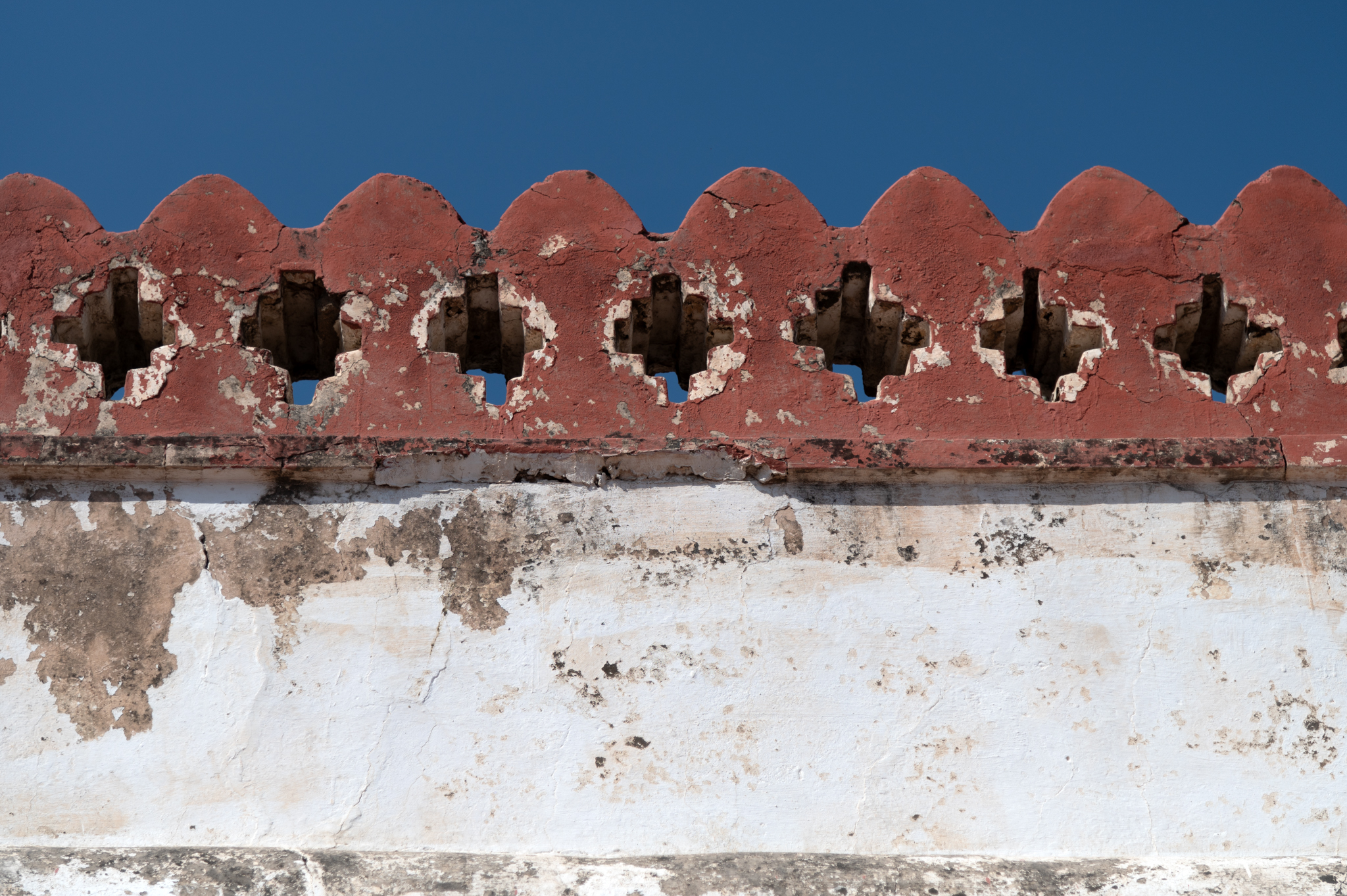 Details of the enclosure wall of the Bhandasar Temple Complex. The floral pattern merlons are only found on the east-facing enclosure wall. These are painted red to resemble brickwork probably.