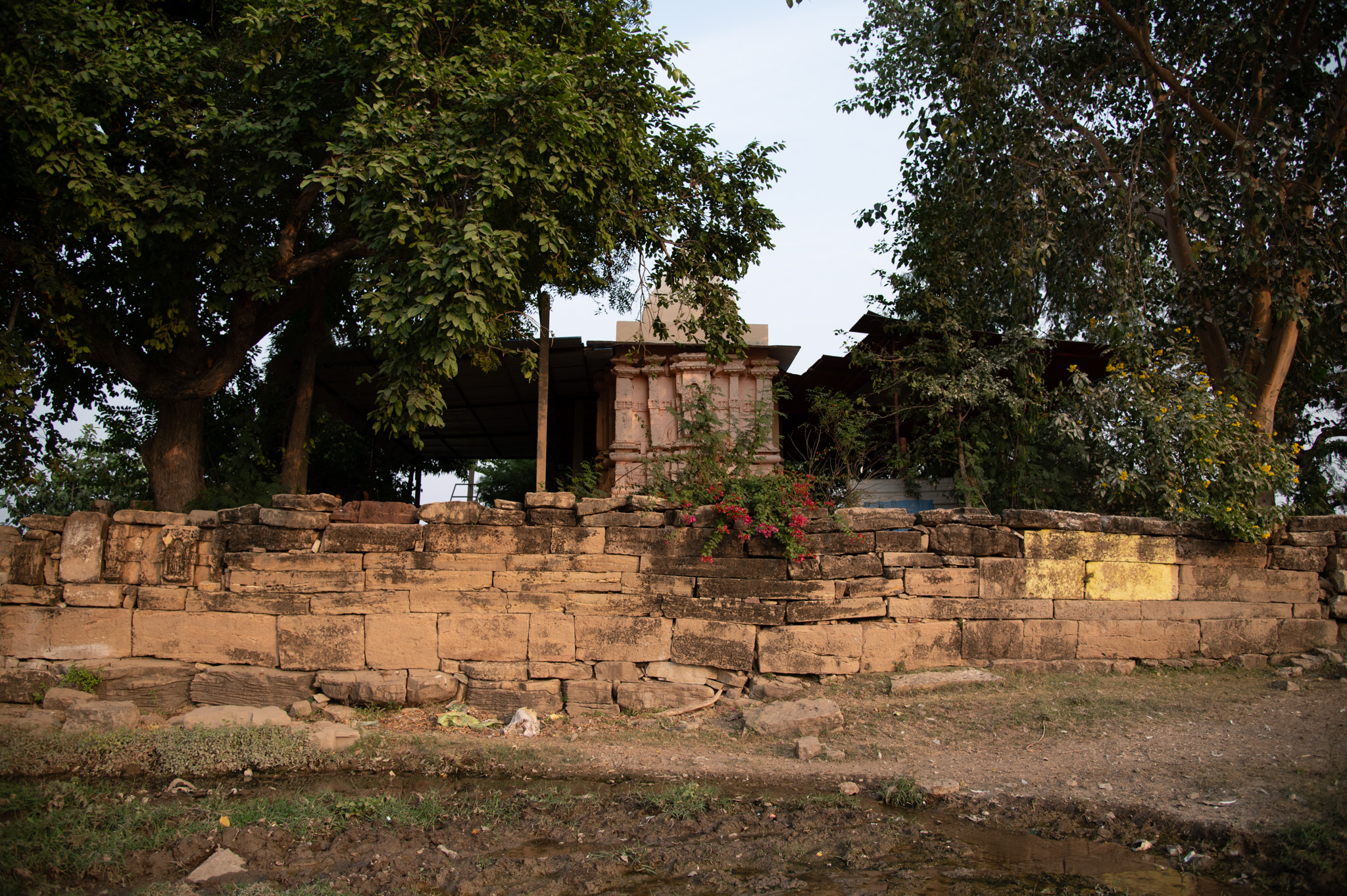 The rear side of the temple faces the road. The rear portion of the garbhagriha has a jangha and shikhara. It is noticeable that the shikhara is plain and simple, unlike the jangha, indicating that the shikhara is likely a later renovated structure. The temple is surrounded by a boundary wall comprising broken parts and fragments of the temple. The present temple complex has various trees and plants inside it, evoking ancient descriptions that temples were often nestled in groves as it was believed that gods liked to reside in nature (groves).