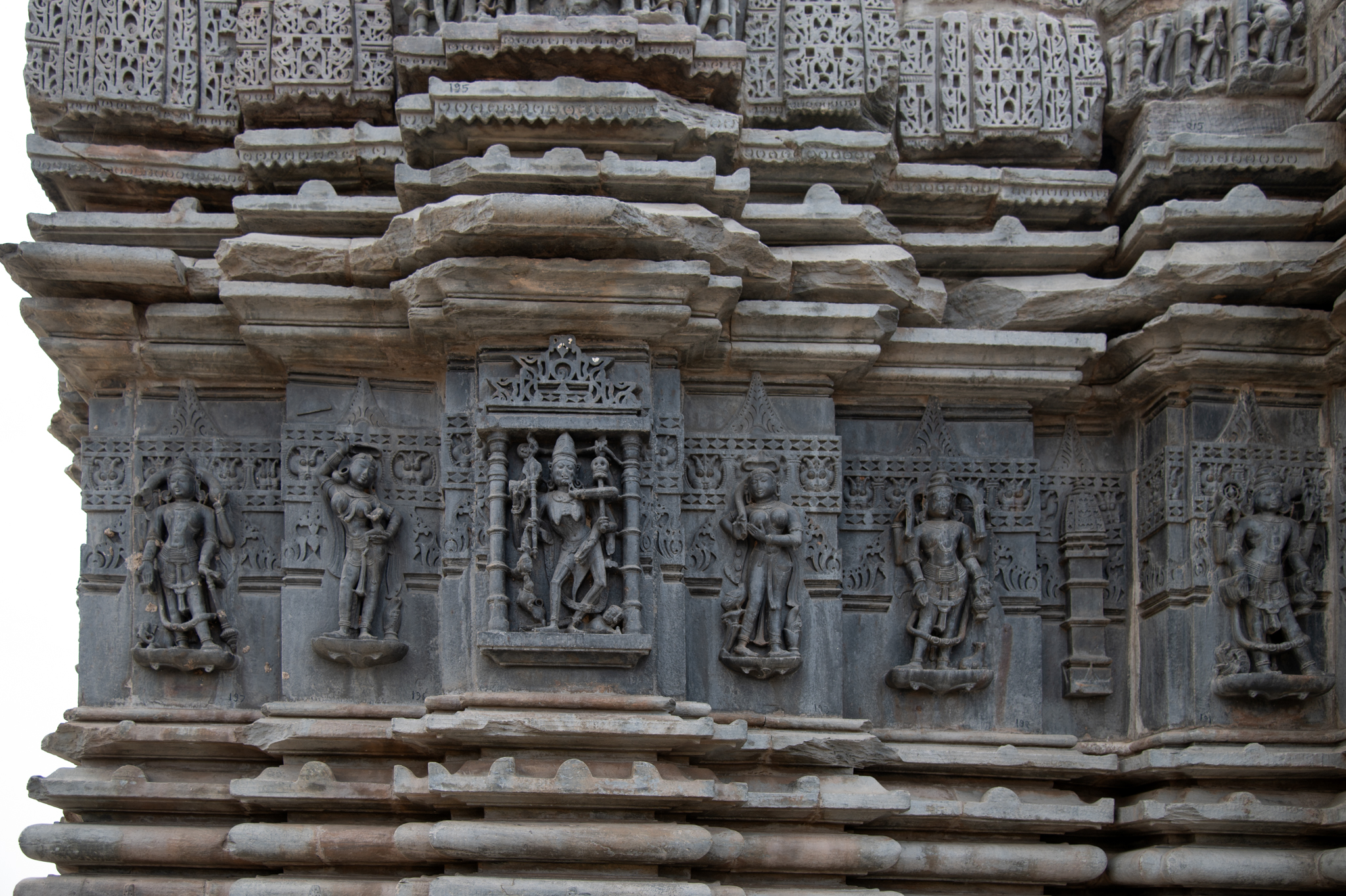 Seen here is the east-facing exterior wall of the Shiva Temple. All the wall projections are adorned with sculptures. The bhadra (central projection) has a sculpture of Chamunda, the intermediate projections have surasundaris (celestial damsels), and the corner projections have dikpalas (deities for cardinal directions). Chamunda is shown in skeletal form. There is a recess separating the main shrine wall and the mandapa (pillared hall), which has a kutastambha motif (a pilaster with miniature shikhara or superstructure).