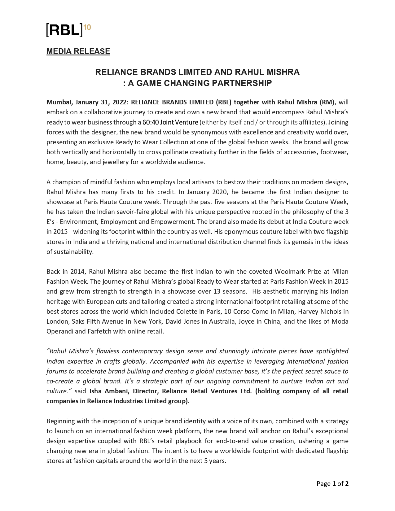 Reliance Retail partners with Rahul Mishra and Abraham and Thakore Público Deposited