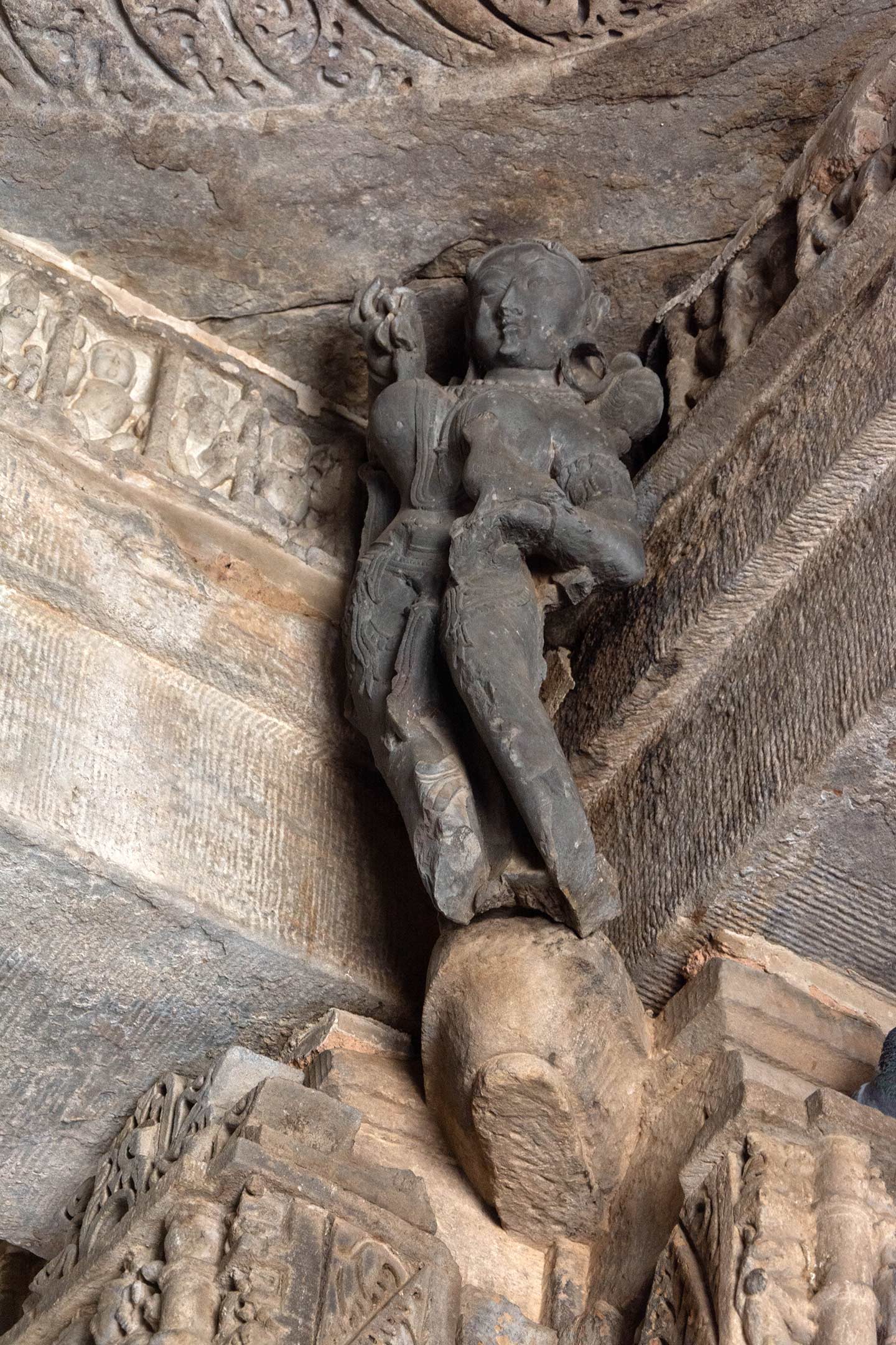 The central pillars of the mandapa (pillared hall) in the Neelkanth Mahadev Temple have depictions of surasundaris (celestial damsels) as female bracket figures above the pillar capitals. These figures are on all four corners of the ceiling. The female figures are carved in a different stone than the pillars, lintels, and walls of the temple interiors.