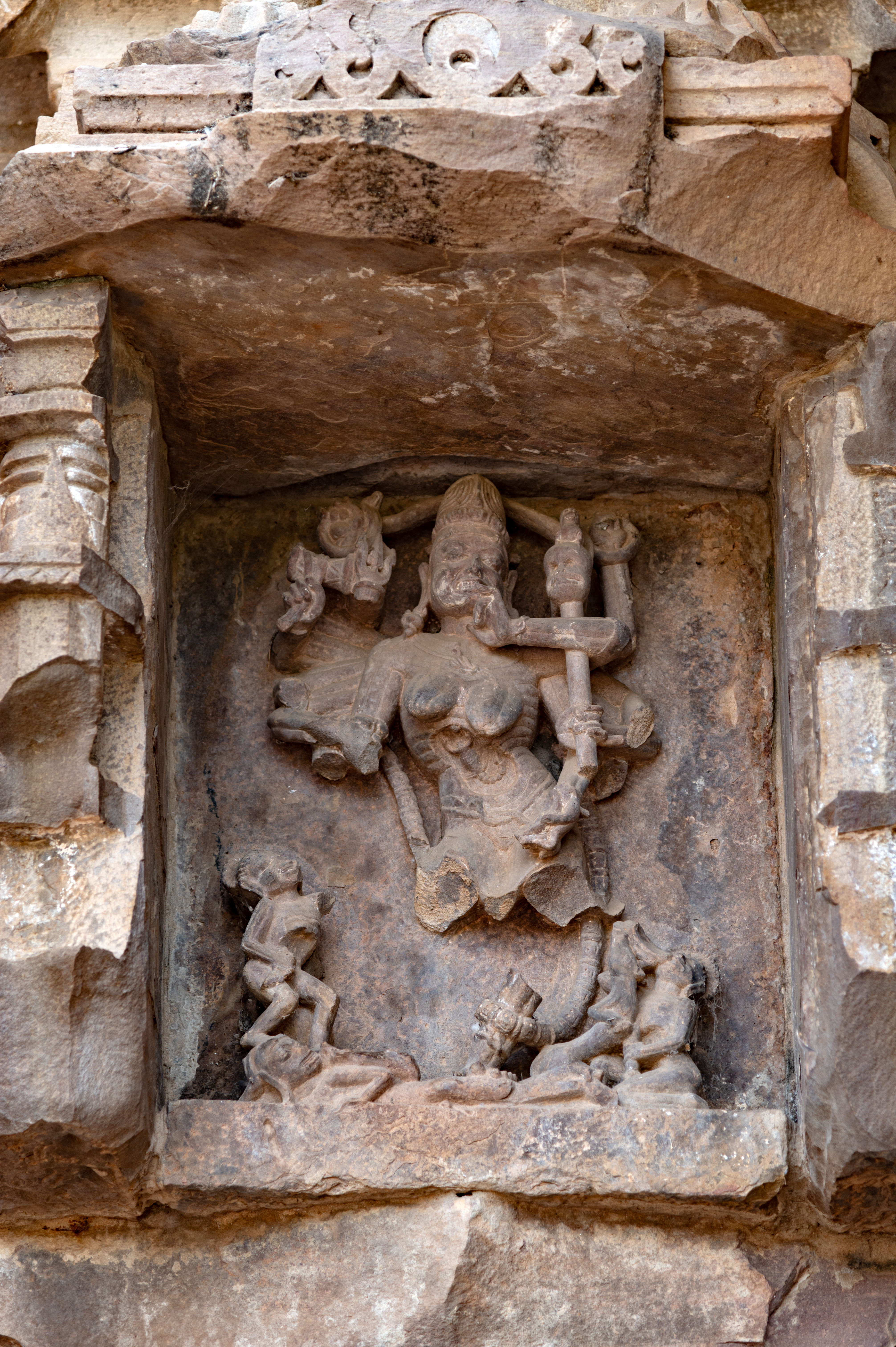 Chamunda stands atop a human form, flanked by two attendants and an animal companion. Though many of her arms are fragmented, her divine attributes are evident. In her upper hands, she carries a sarpa (snake). Her intact right arms carry a damru (drum) and a trishula (trident), while her left hands cradle a khatvanga (staff with a human skull) and a bowl, with the finger of her left hand touching her lips. Chamunda’s portrayal emphasizes her skeletal form, with a cavity in her belly housing a scorpion, symbolizing transformative power. Her lower body is draped modestly with a loin cloth. Adjacent to her, a seated figure grasps a bowl from which he is drinking. It is speculated that one of the Goddess’s broken hands may have held a munda (severed human head). The presence of the seated figure suggests the consumption of the blood dripping from the severed head.