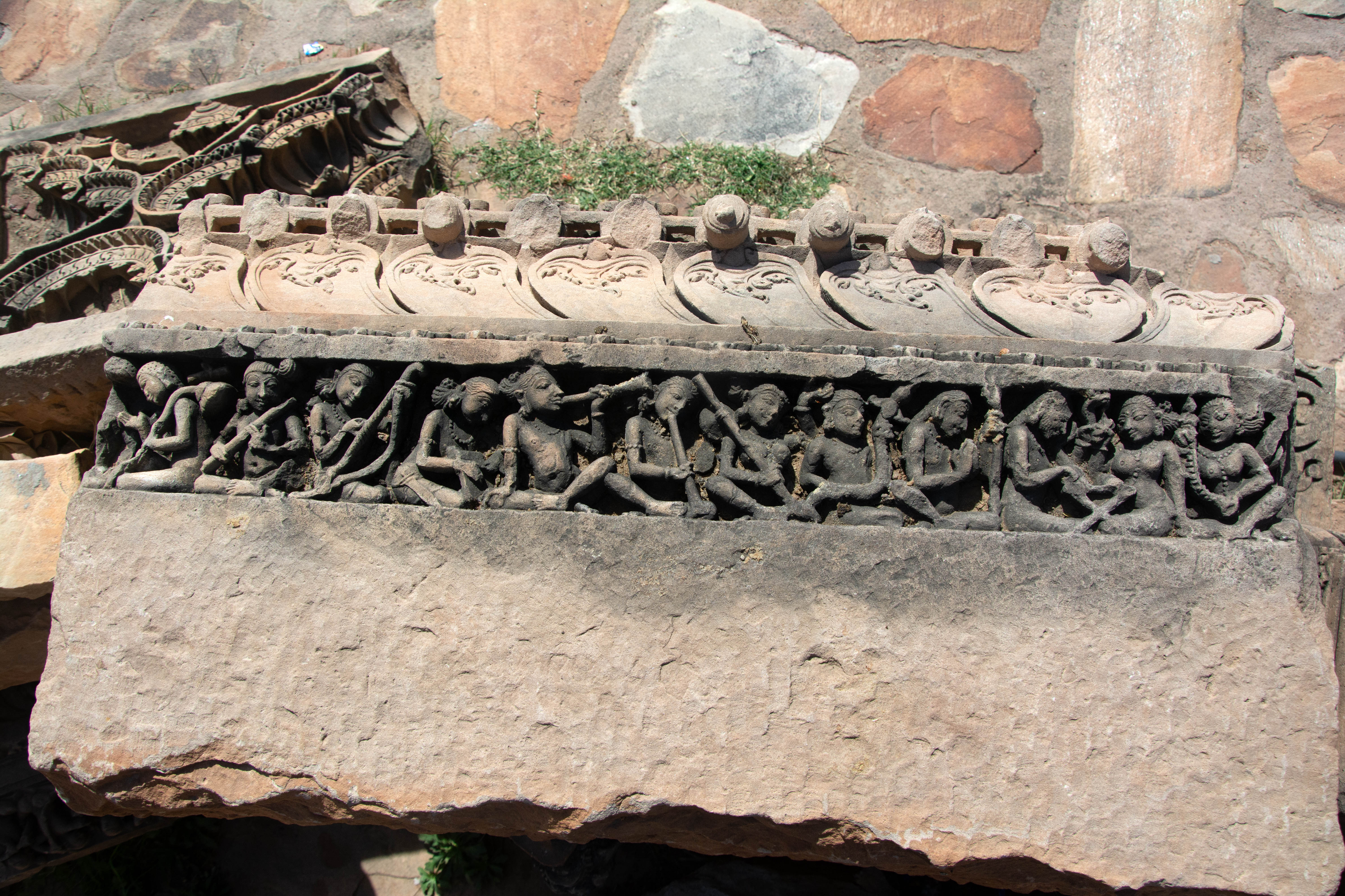 This interesting fragment depicts a senior ascetic, likely a Shaiva ascetic, positioned in the extreme right corner, delivering a sermon to a lady. To his left, there appears to be his disciple showing reverence to his guru. Following them, there is a series of garland bearers and musicians facing the venerable guru. Despite some damage to the fragment, it appears that the guru is not a simple human but a divine being with four arms. He seems to be holding a snake and trident in his upper two hands. It cannot be ascertained whether the figure is Shiva delivering a sermon to a lady, possibly Parvati, or if he is Lakulisha.