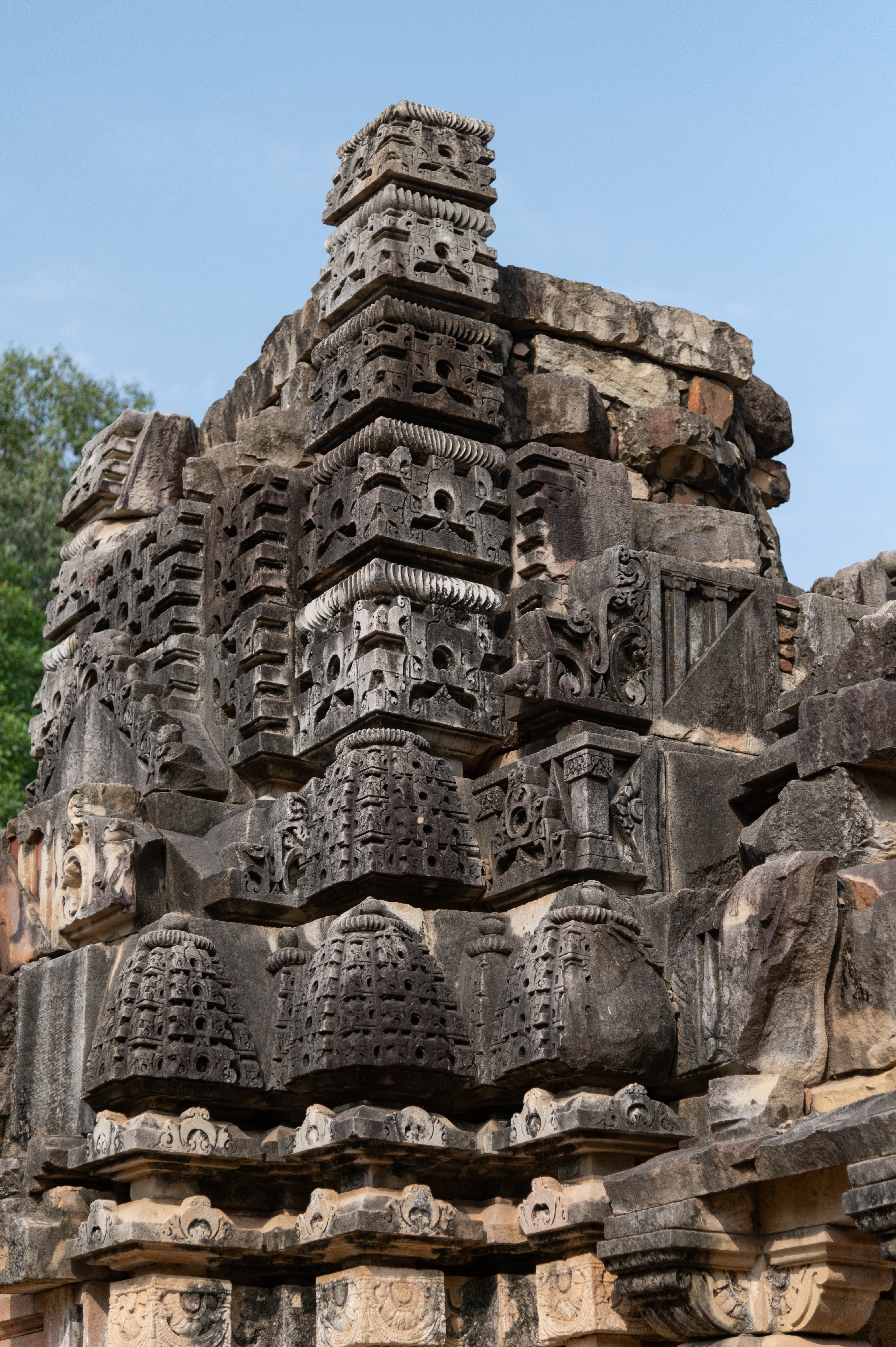 The shikhara (superstructure) of the garbhagriha (sanctum sanctorum) of the Shiva Temple (Temple 3) is severely damaged, but remains of the mulamajari (central or main spire) can still be seen, carved with the jala of miniature gavaksha (dormer window) motif. The karnaratha (decorative pilasters) of the present superstructure shows five bhumis (tiers), and the arrangement of the anga shikhara (minor spires) can be seen just above the varandikas (moulded parapet).