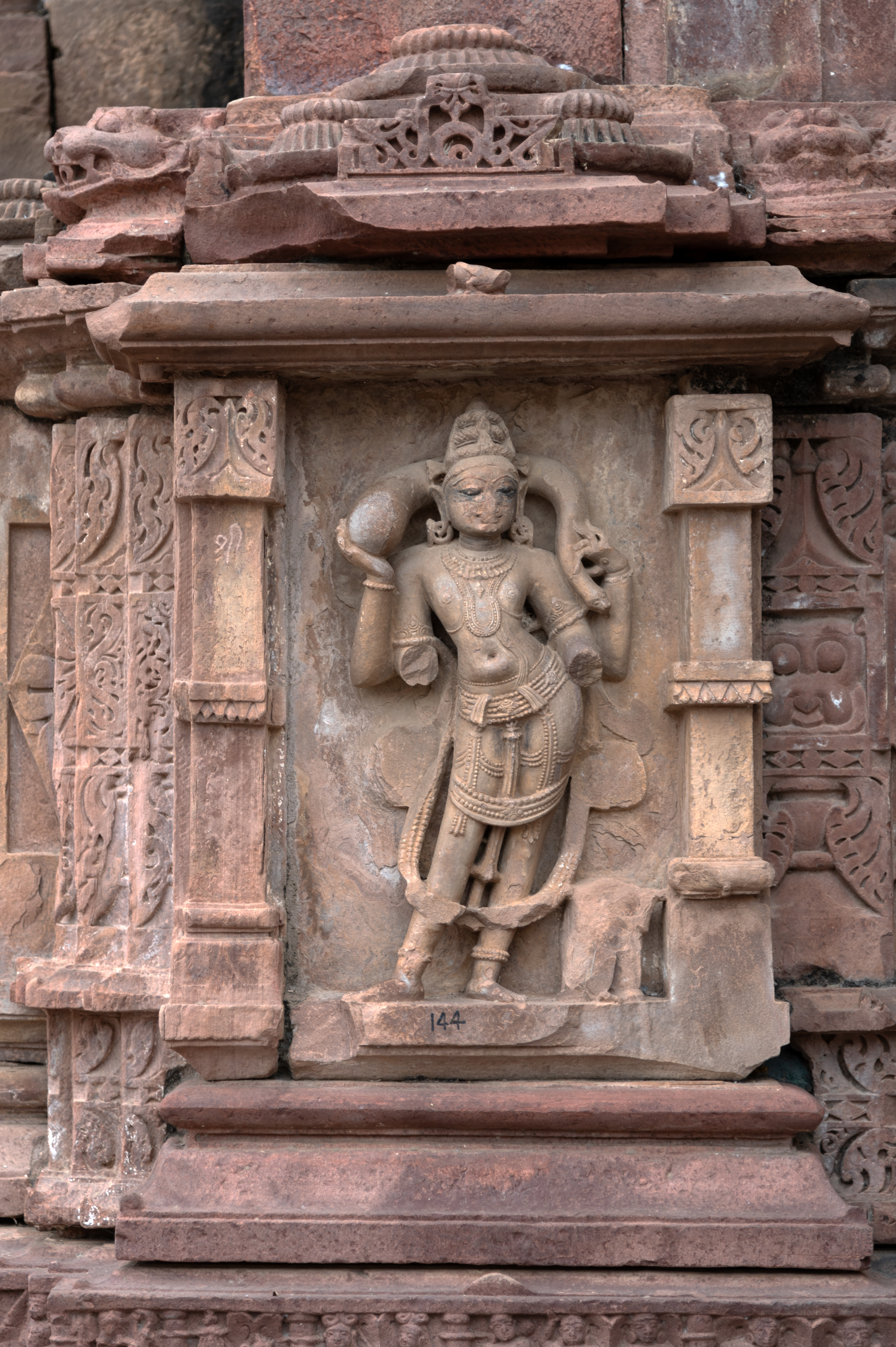 Closer view of the dikapala (gods of cardinal directions) Kubera in the devakoshtha (niche) along the mandapa (pillared hall) dwarf walls of the Mahanaleshwar Temple. Kubera corresponds to the northern direction. The lower two hands of the deity are broken but the upper two hands hold a nakula (money) bag, one of the distinctive attributes of Kubera. The devakoshtha is composed of two slender pilasters surmounted by a miniature samvarna (pyramid-shaped) variety of shikhara (superstructure). The ghantas (bells) of the shikhara are fronted by a udgama (gavaksha or dormer window design). It rests on a low pedestal made up of multiple mouldings.