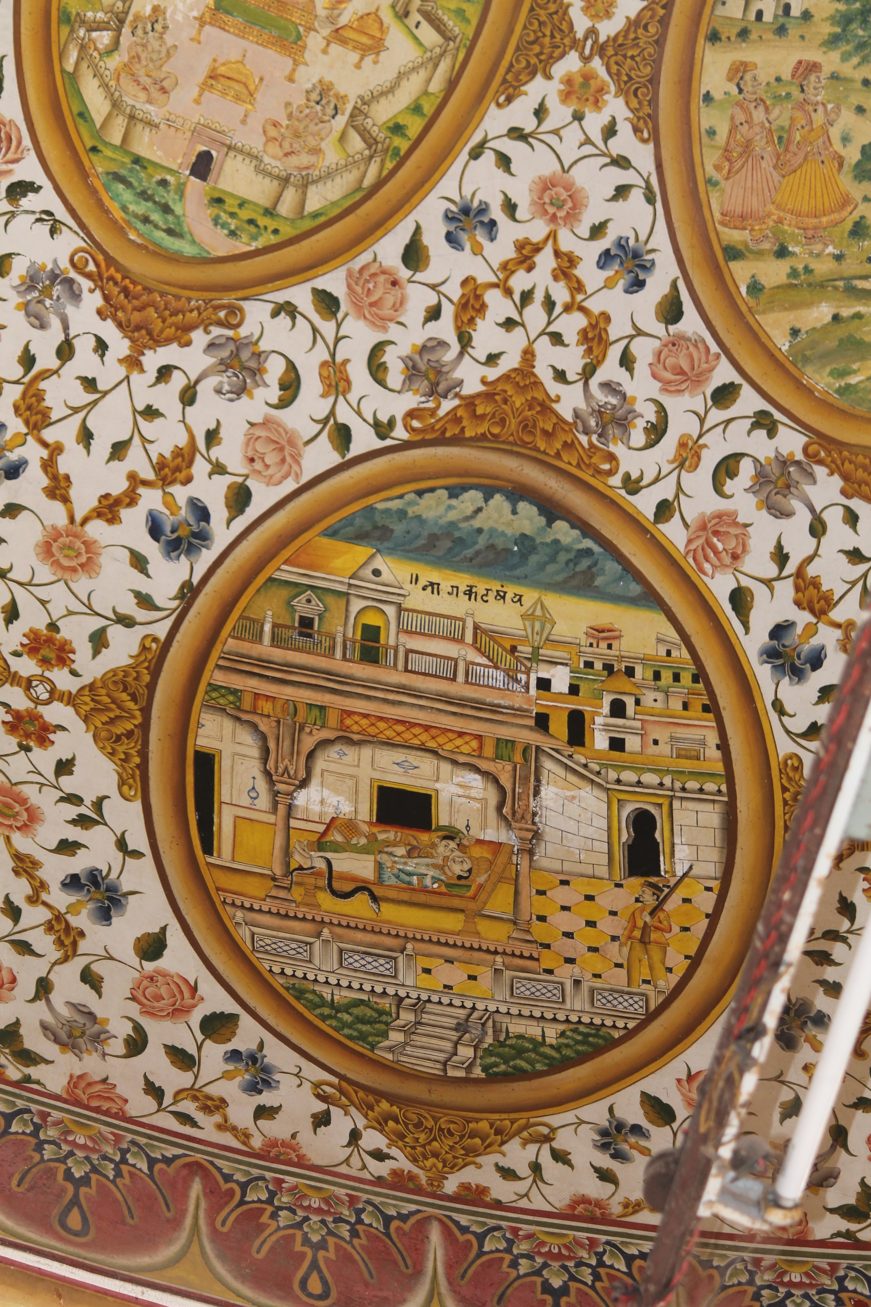 The ninth oval painting (in clockwise order) in the lower/outer circle in the ceiling of the mandapa (pillared hall) is difficult to decipher. It appears to depict a sleeping couple, with a snake near the leg of the man. Outside the haveli (mansion) which houses this couple, there is an armed figure that looks like a soldier or guard in uniform.