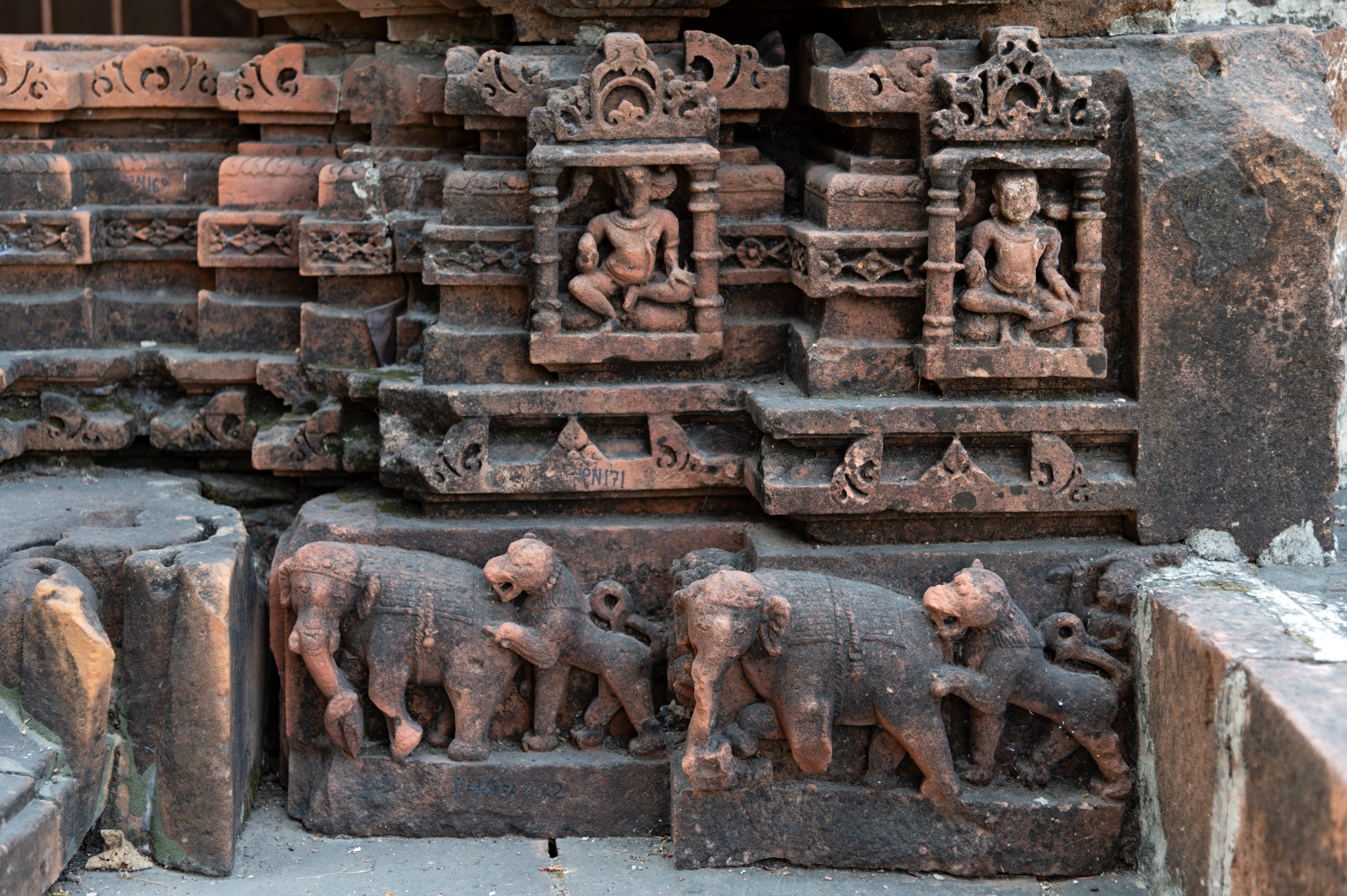 The details of the garbhagriha (sanctum sanctorum) are seen here at the bottom of the entrance of the Vishnu Temple. Flanking the chandrashila (moonstone) at the garbhagriha entrance is a band that shows vyalas (composite mythical creatures) pouncing upon and biting elephants from behind and tearing them apart with their claws.