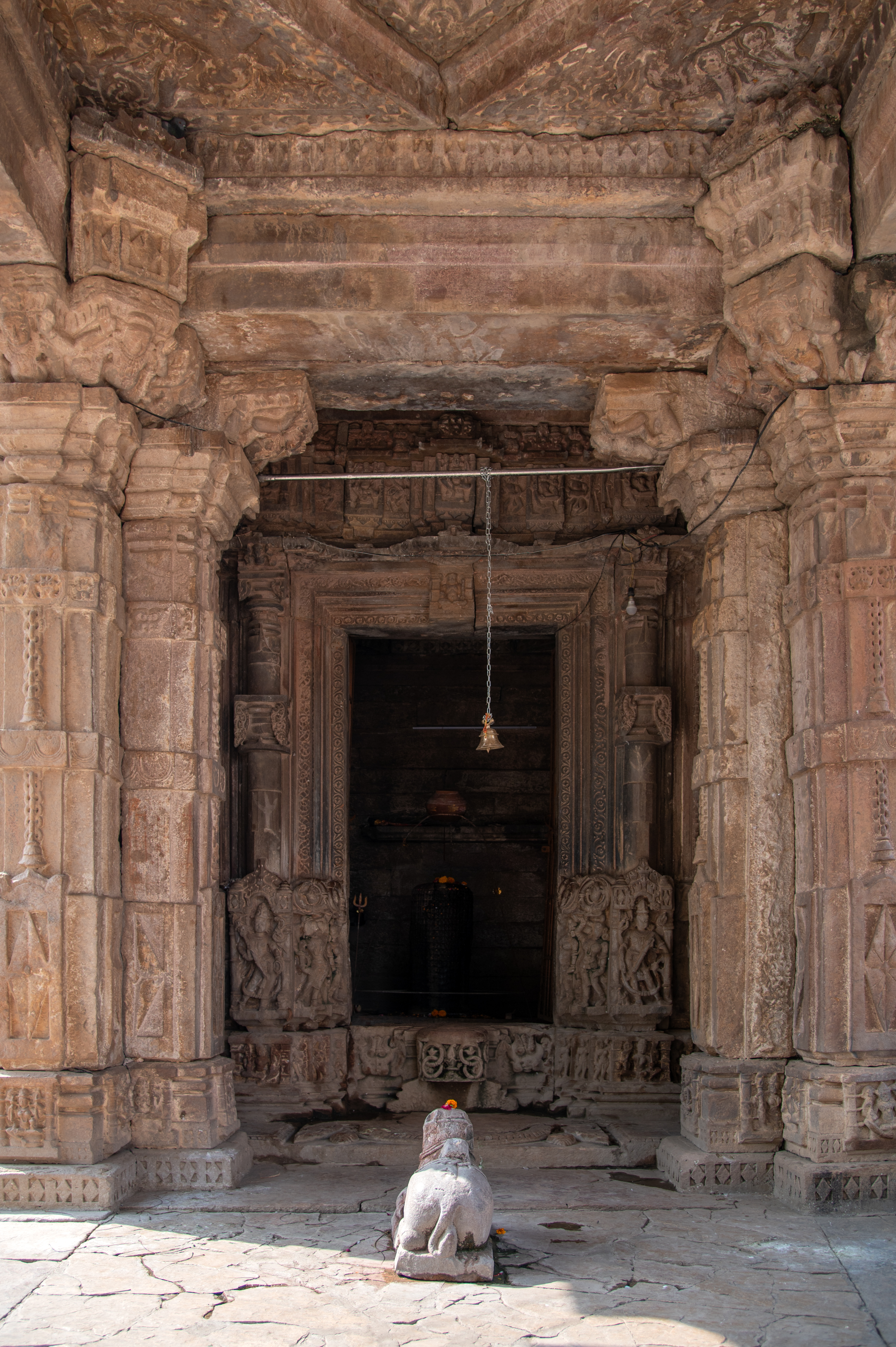 The mandapa (pillared hall) of the Hazareshwar Temple is a small square open hall which stands on a low base, supported by four pillars positioned at its corners. These pillars feature square bases adorned with depictions of deities. The shaft of the pillars is intricately carved with male deities, musicians, dancers, and surasundaris (celestial damsels). Transitioning into an octagonal shape, then into sixteen facets and circular, the shaft culminates with an abacus supporting bharavahaka (load bearers) brackets, which in turn uphold the lintel. The mandapa's ceiling, square in shape, is exquisitely carved. There is an idol of Nandi housed at the centre of the mandapa.