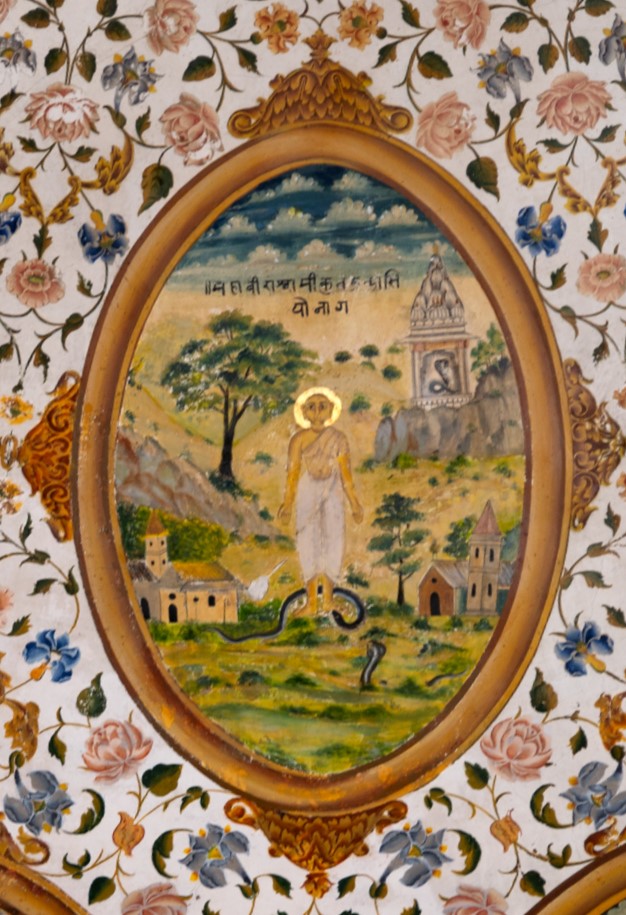 The painting in the inner/upper circle in the ceiling of the mandapa (pillared hall) likely depicts the story of Chandakaushika Nag and Mahavir. According to the tale, as Mahavir travelled through a forest, a snake named Chandak blocked his path. However, Mahavir instead of being scared of him stood at the place firmly. Chandak bit the Tirthankara, yet the latter remained calm, intending no harm to the snake. This story intends to teach everyone the importance of controlling anger and cultivating compassion. Mahavir has a divine halo behind his head, painted in golden colour. A temple dedicated to the snake is shown at the background of the painting. The inscription from this painting is not entirely legible, but it certainly includes the name of Mahavir Swami.