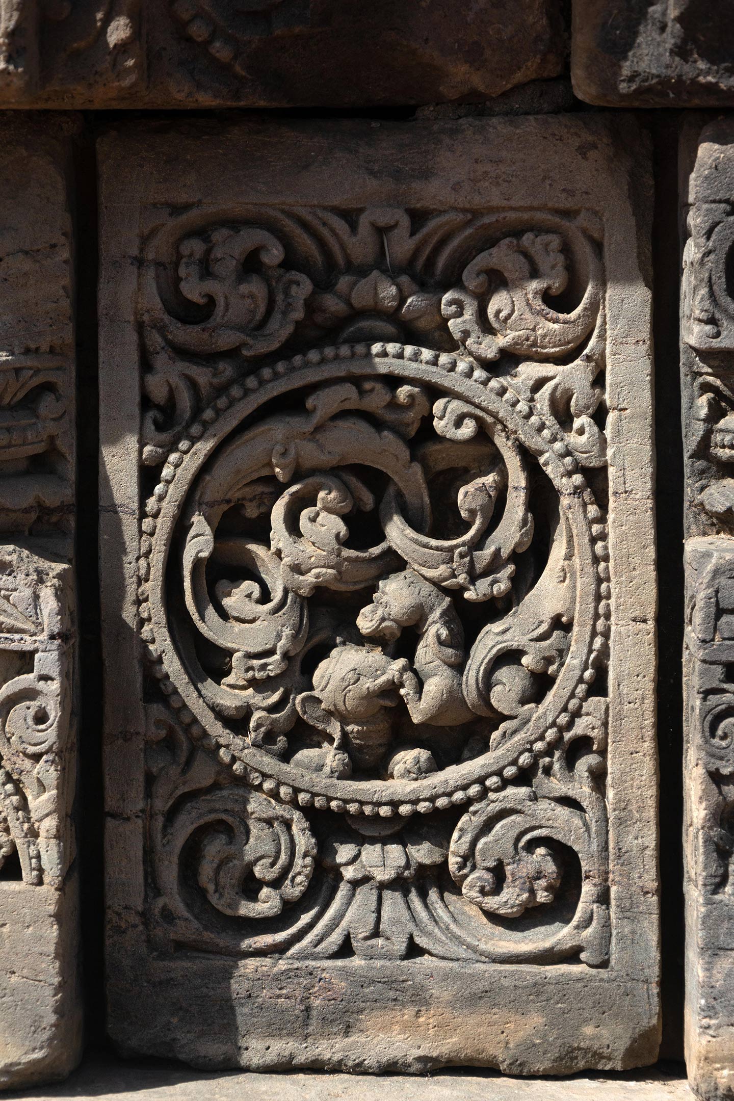 Tablet-like plaques are placed on the adhisthana (facing east). These plaques depict various types of flora and fauna as well as hybrid creatures like kinnara, vyala, and makara. The plaques are tightly arranged, richly detailed, and deeply carved, creating contrasting shadows that make the artwork look three-dimensional in sunlight. The central artwork of the plaque is in the form of a circular medallion surrounded by a foliage motif. Seen in this plaque, simha (lion) vyala and gaja (elephant) vyala engaged in a fight. The rest of the plaque is decorated with ardha padma (half lotus) and kalpa lata (creeper) motifs.