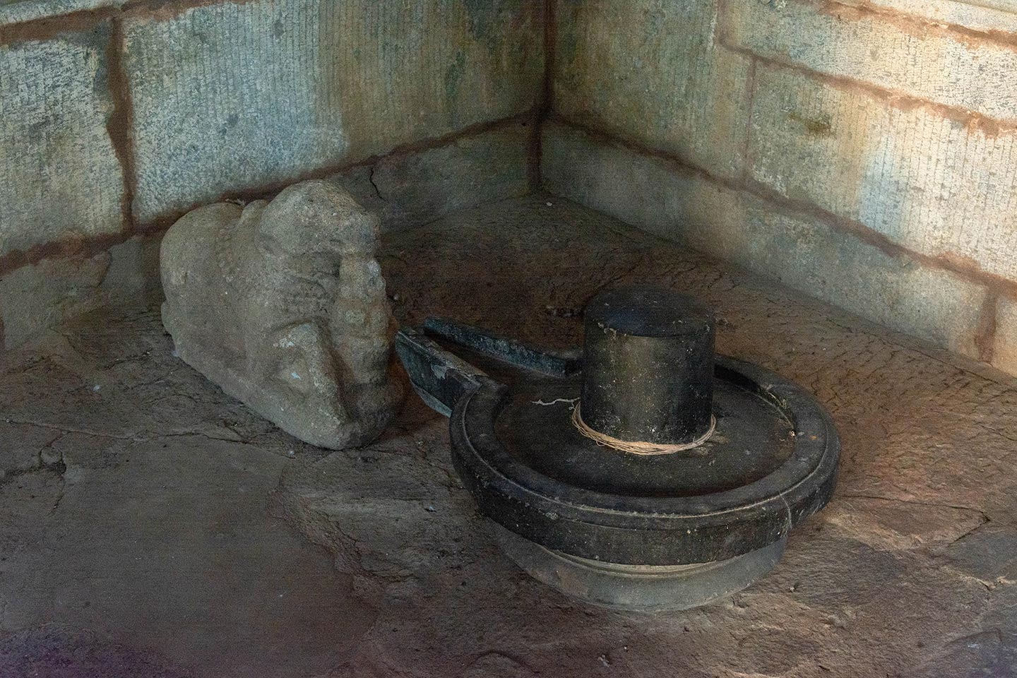 Inside the mahamandapa (pillared hall), in its northeastern corner, rests a black Shiva linga (aniconic representation of Shiva) on a yonipatta (womb-shaped base slab) dating from a later period. A loose sculpture of a seated Nandi is also kept inside the mahamandapa, near the antarala (vestibule or antechamber), and features a prominent hump.