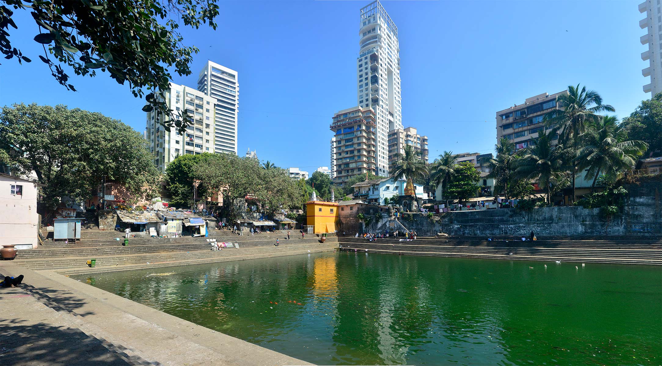 Towering skyscrapers built on Malabar Hill overlook Banganga Tank. In the 18th century, the hill was densely forested and visited only by Hindu pilgrims and Malabari pirates. Later, in the 1880s, the British Governor shifted Raj Bhawan from Parel to Malabar Hill and the neighborhood has since been one of the most sought-after real estates in Mumbai.