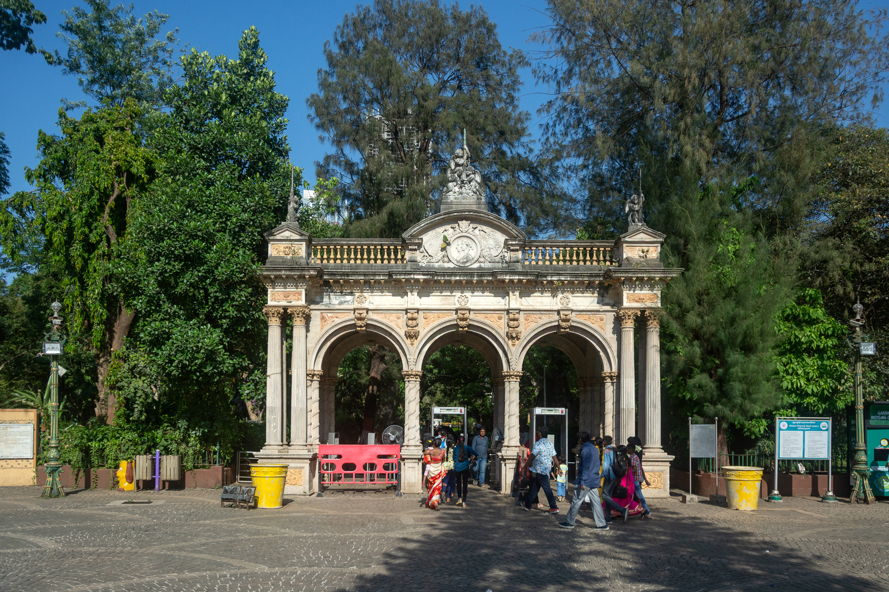 Completed in 1868, the triple-arched gateway is the main entrance to Jijamata Udyan. William Tracey designed it in the Neo-Palladian style to resemble a Roman triumphal arch. The narrow width between the arches prevented horse-driven carriages from entering. The pediment over the central arch depicts profile portraits of the Prince and Princess of Wales.
