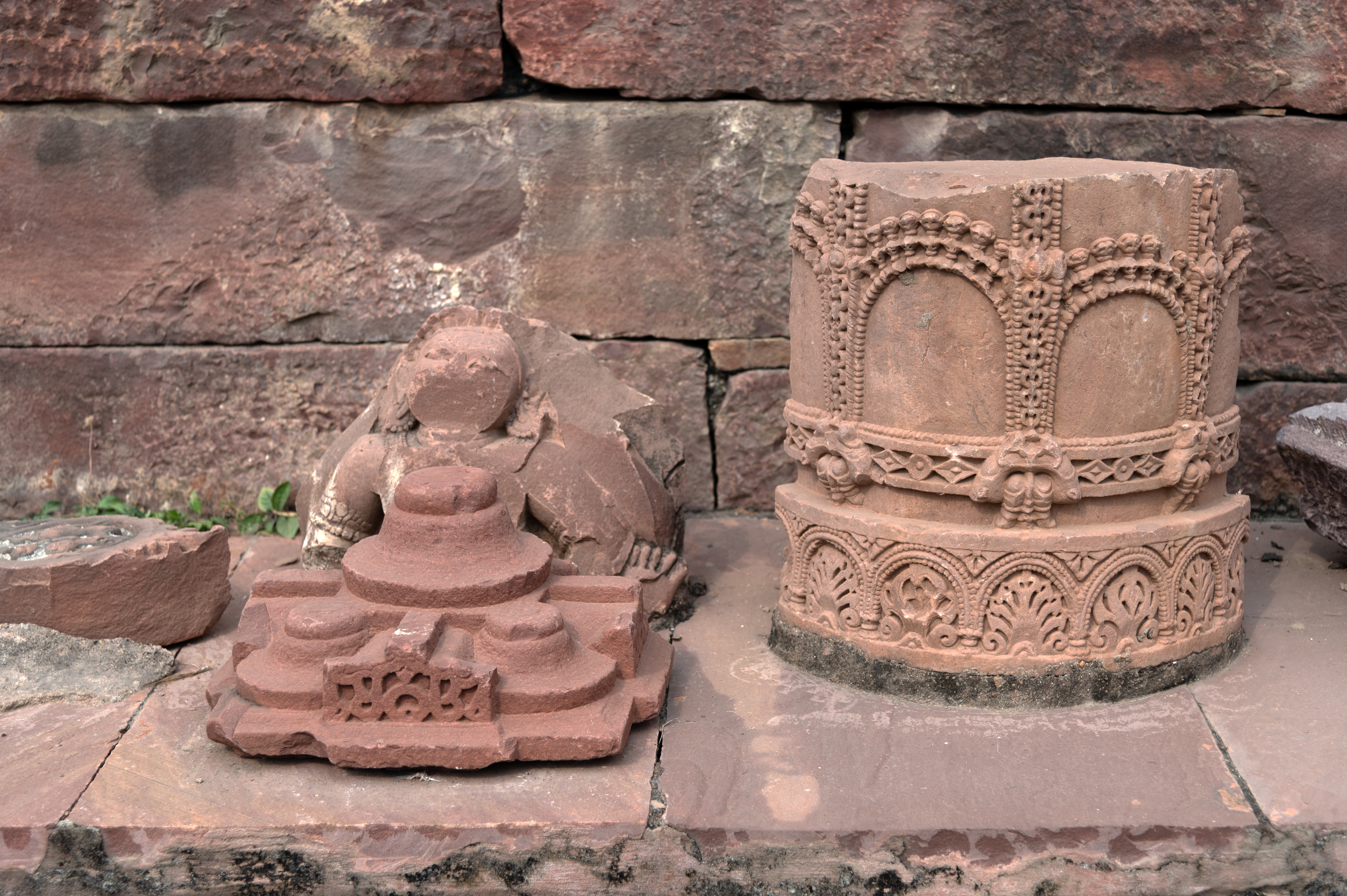 Different architectural fragments are dispersed next to the pratoli (entrance gateway), in the premises of the Mahanaleshwar temple complex. Seen here are fragments of a pillar capital, part of the samvarna shikhara (pyramidical superstructure) of the mandapa (pillared hall), and a pillar fragment. Minute carvings on the round shaft remnant of the pillar.