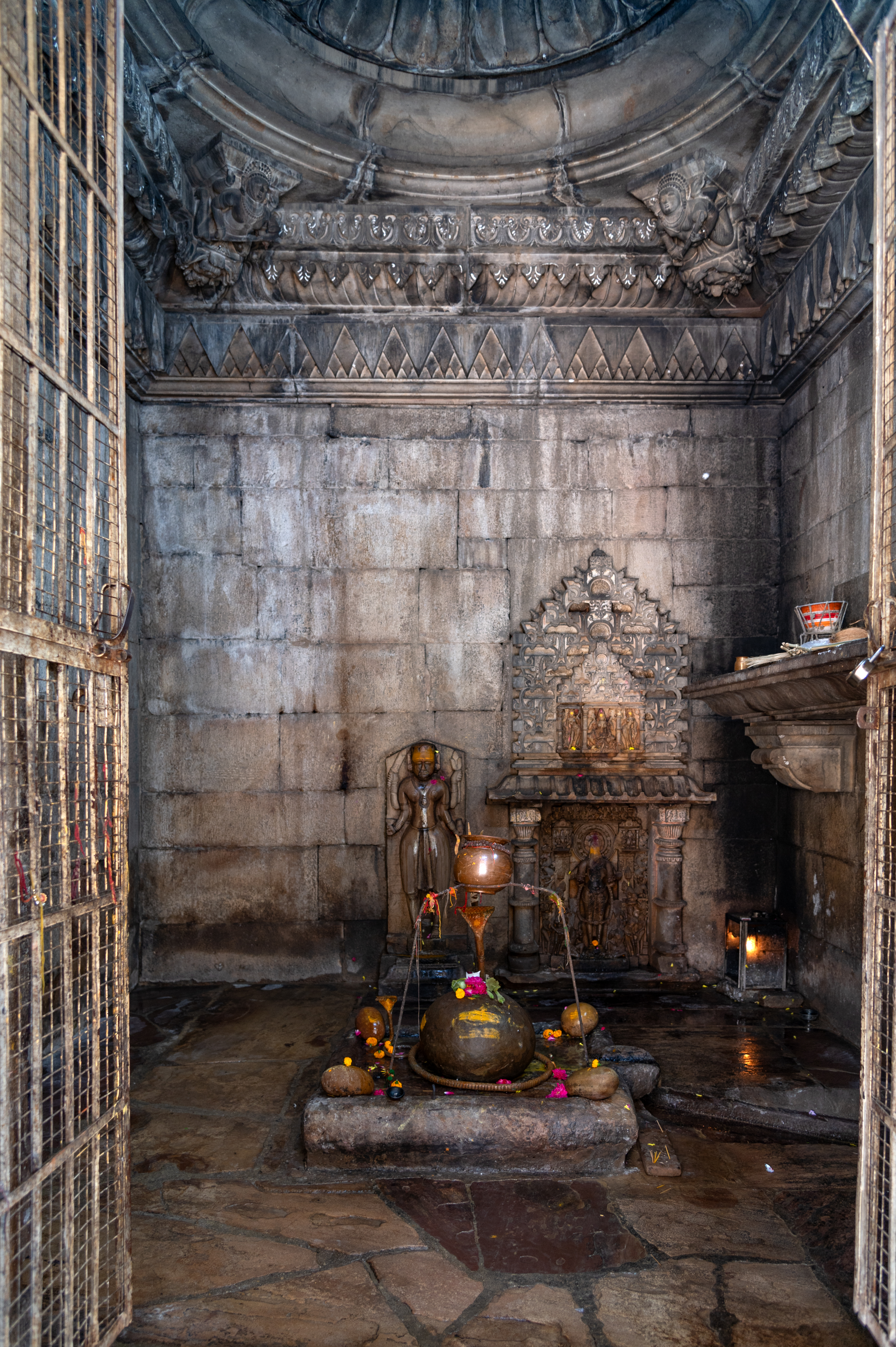 The garbhagriha (sanctum sanctorum), square in shape from the inside, features a distinct round or ghata (pot-shaped) linga, from which the temple derives its name, Ghateshvara. On the rear wall, a niche with an udgama (pediment of interconnected chaitya dormers) is fixed, housing a figure of a deity (currently without a head). Adjacent to it is another sculpture of a four-armed Goddess. The sculpture of this Goddess may belong to a later period, as her appearance differs from other sculptures in the temple.