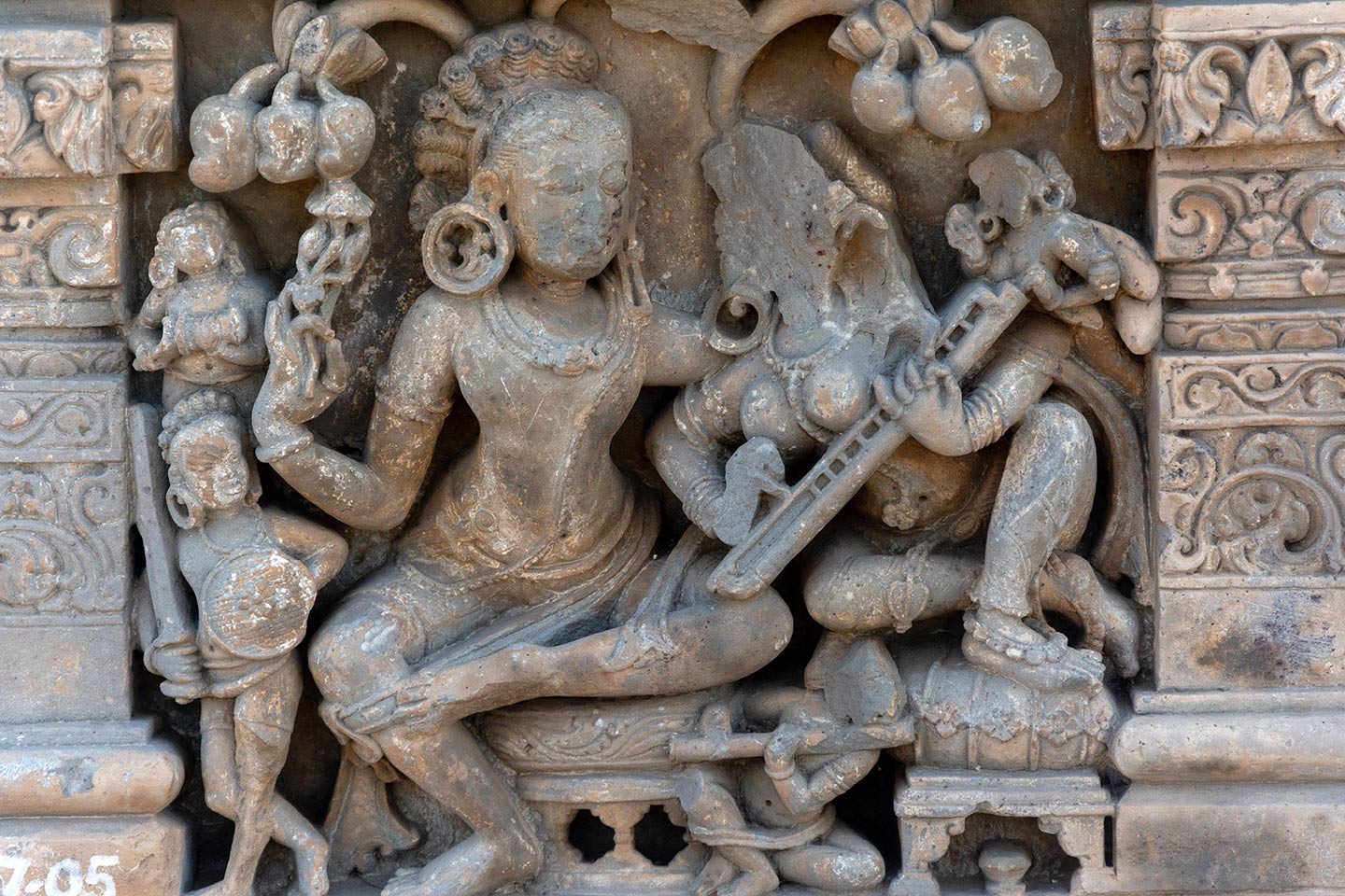 Couples invoking shringara rasa (associated with romance, love, and attractiveness between lovers) are framed in panels with pillars and tiered shikhara with gavashka (horseshoe) motifs. The face of the female figure is missing and the face of the male figure is defaced. They are wearing heavy jewellery, elaborate headgear, and garments, indicating they are a royal couple. The central male figure and female figures are enjoying a musical concert in a grove. They are seated on circular raised seats; the male is in a lalitasana pose. The female figure is leaning towards the male and playing a stringed musical instrument (likely a veena). They are surrounded by four smaller figures. A male soldier is holding a sword and shield (on the left). One musician is playing the flute (bottom), sitting between the seats. A small female attendant is (top right) whispering in the ear of the central female. Mangoes hang from the tree branches.